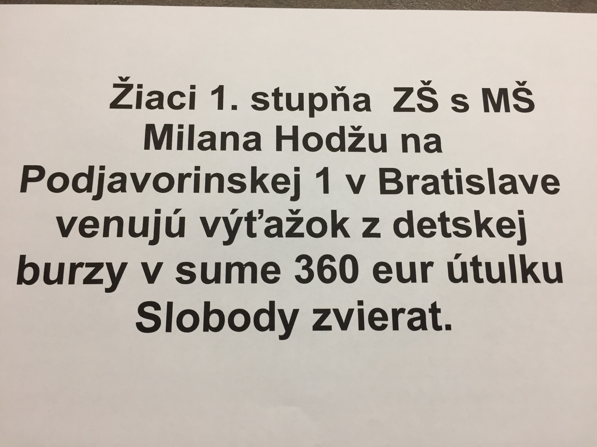 Žiaci 1. stupňa ZŠ s MŠ Milana Hodžu venujú výtažok z detskej burzy v sume 360 eur útulku Slobody zvierat.