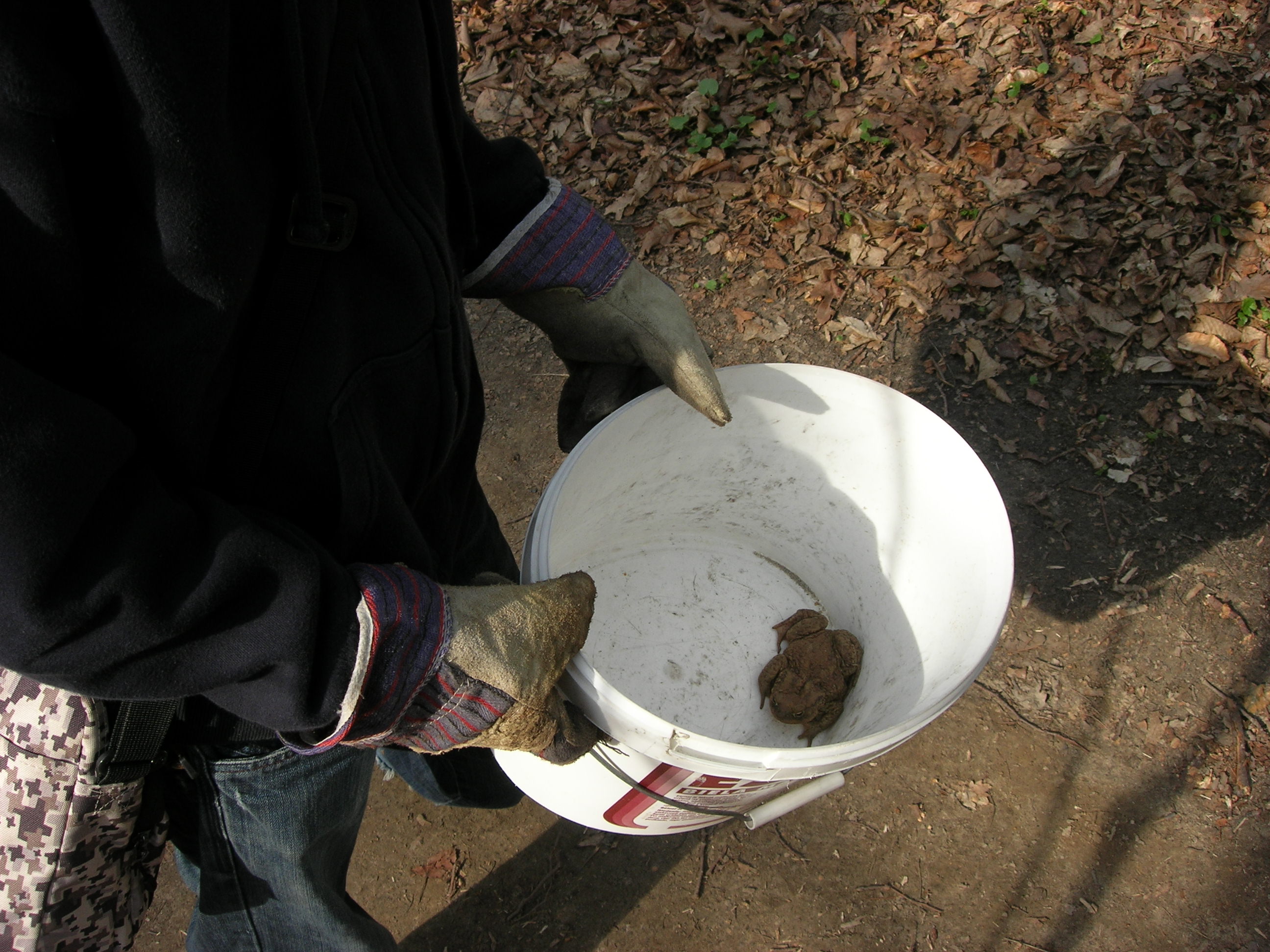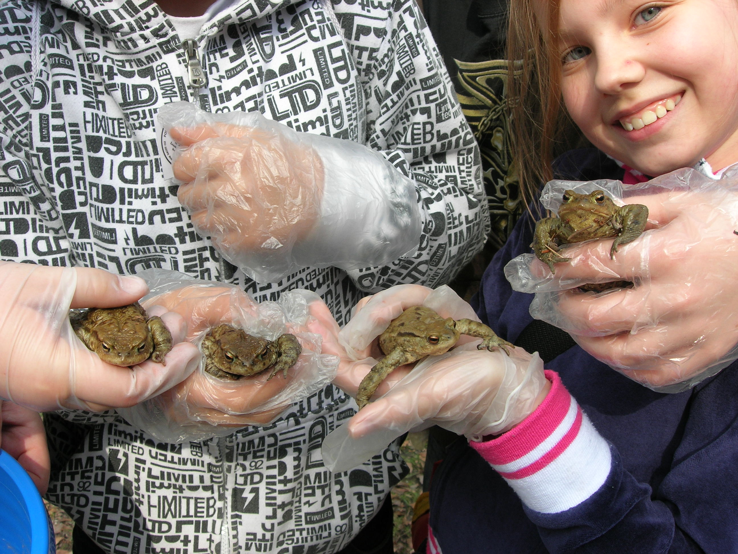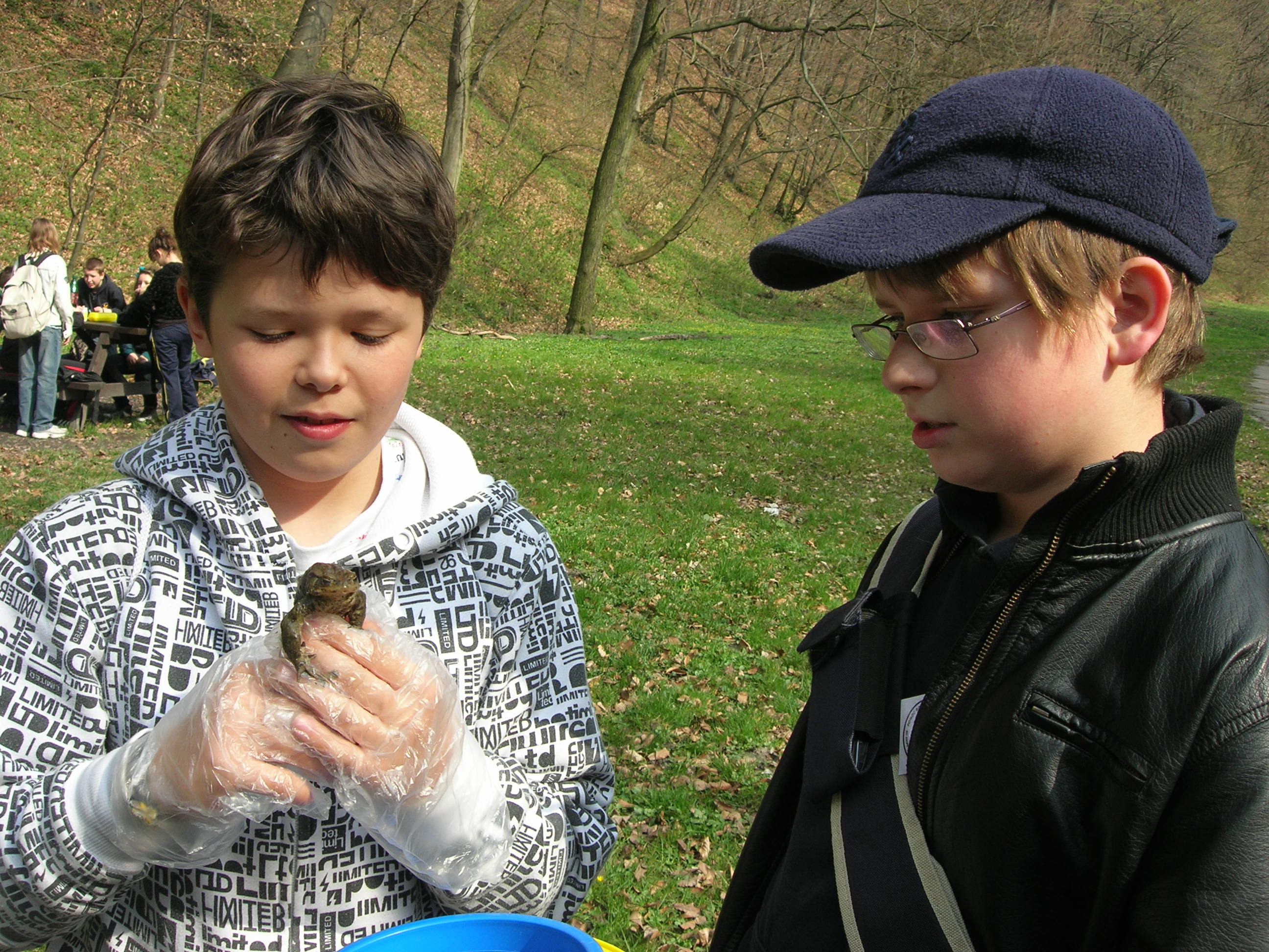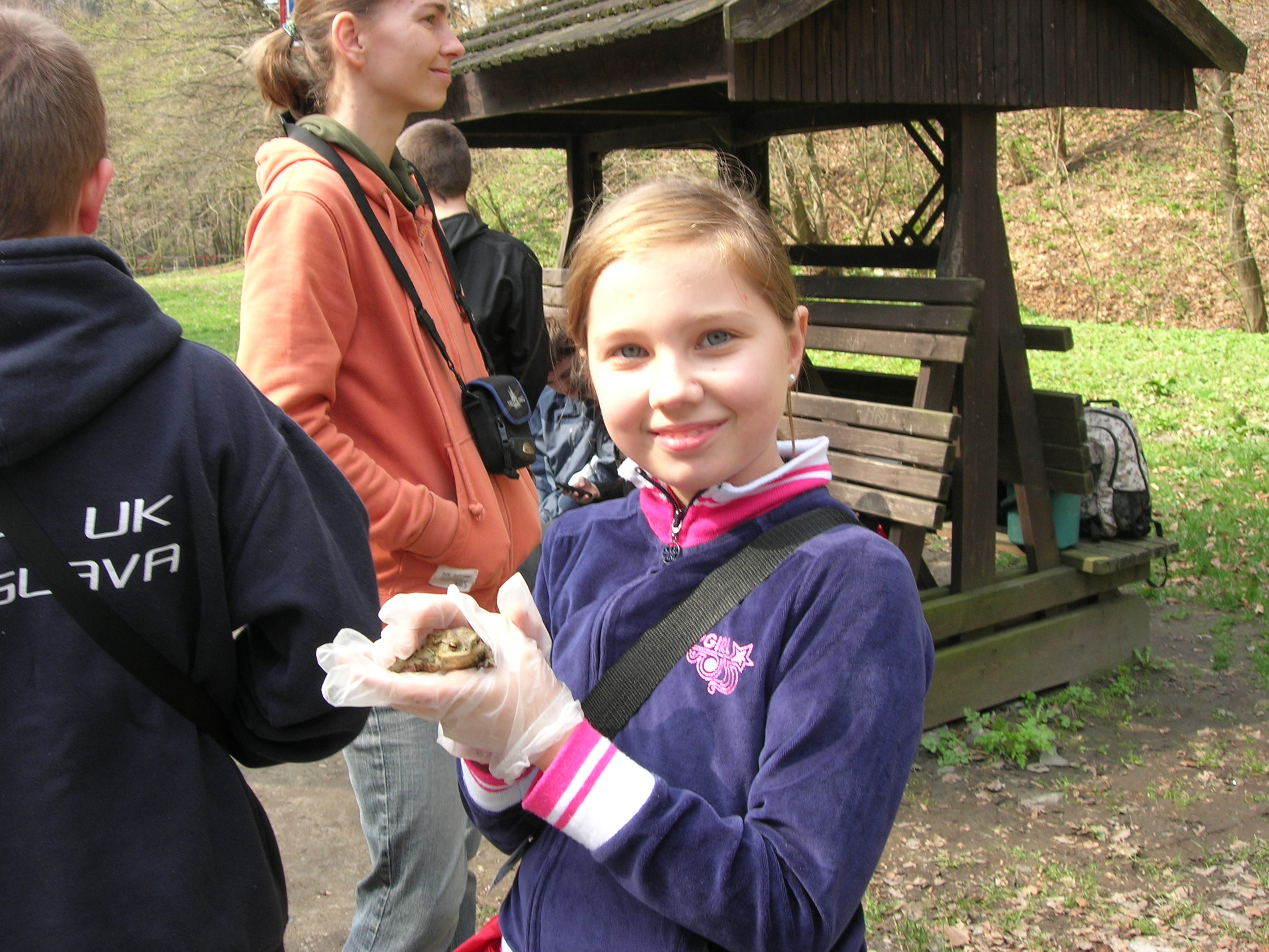 Všetko riadila organizácia Miniopterus a príroda… V polovici marca sa oteplilo. A tak dobrovoľníci postavili popri ceste fóliové zábrany (pomoc pri stavbe je vždy vítaná!). VI. A už mala dohodnutý termín prenášania žabiek, ale žabky nikde. Zrejme ich zabrzdili pomerne nízke nočné teploty a premenlivé počasie. Tak sme sa nakoniec dostali na koniec zoznamu pomáhaniachtivých škôl. A žabky, tak ako váhali so štartom, potom sa nezvyčajne rýchlo presunuli z lesa do vody. 4. apríl, to bol náš deň, lebo už väčšina žiab migrovala späť do lesa. Keďže nás hneď po vystúpení z autobusa privítal nepekný pohľad na pár rozmliaždených žiab na ceste, neváhali sme a začali sme žabky prekladať pekne za cestu, do lesa, tam, kam mali namierené. Niekto holými rukami, niekto v rukaviciach, niekto s jakotom (v lese sa nekričí!) a niekto vôbec.