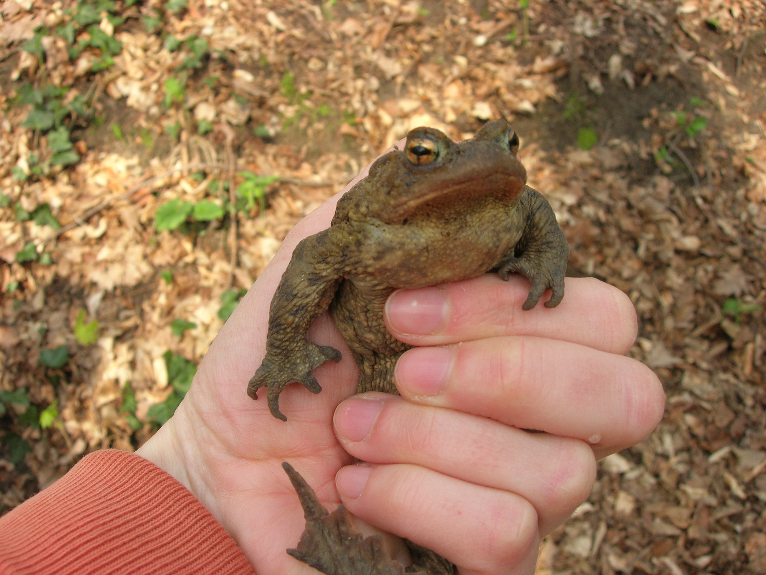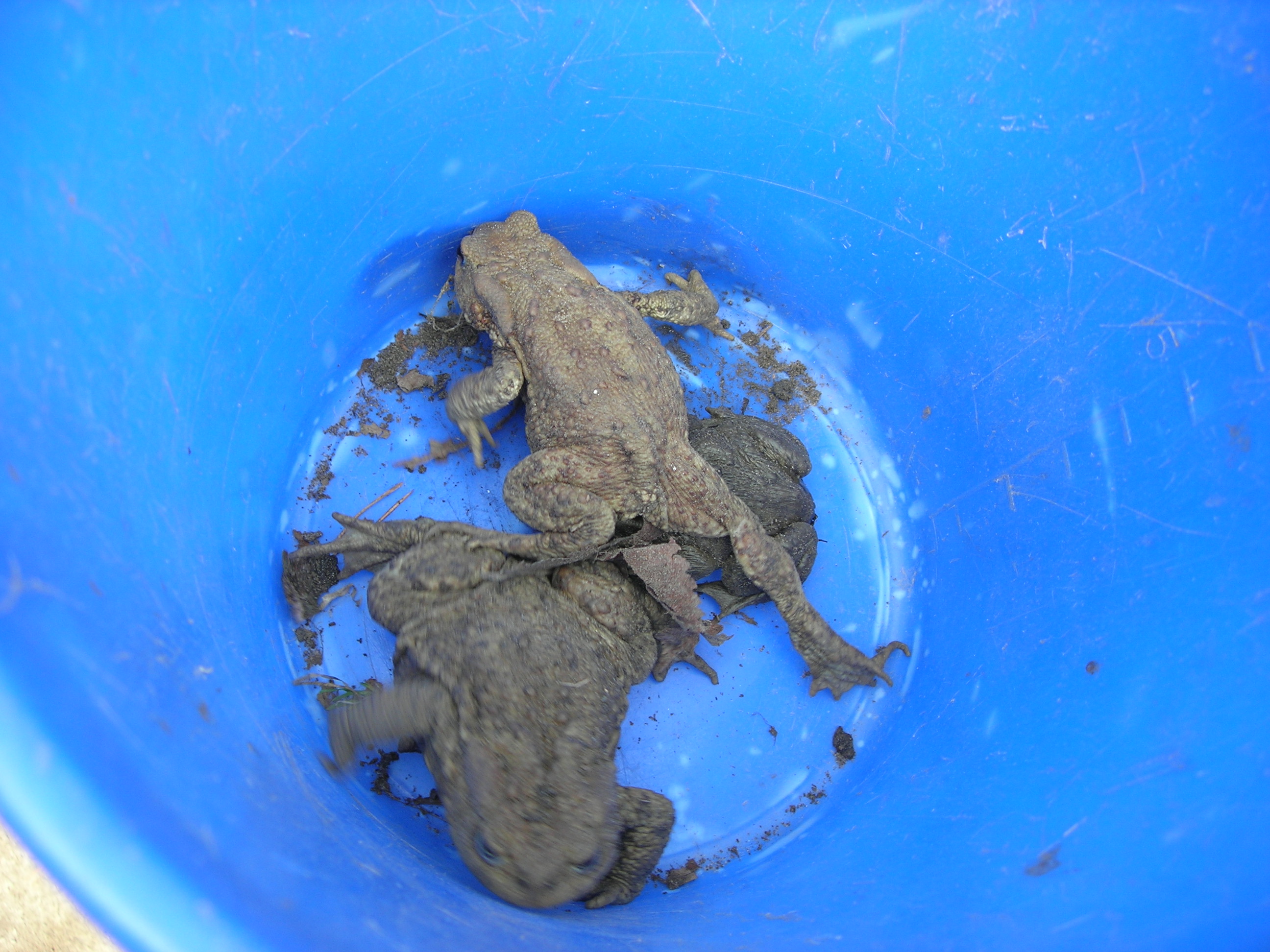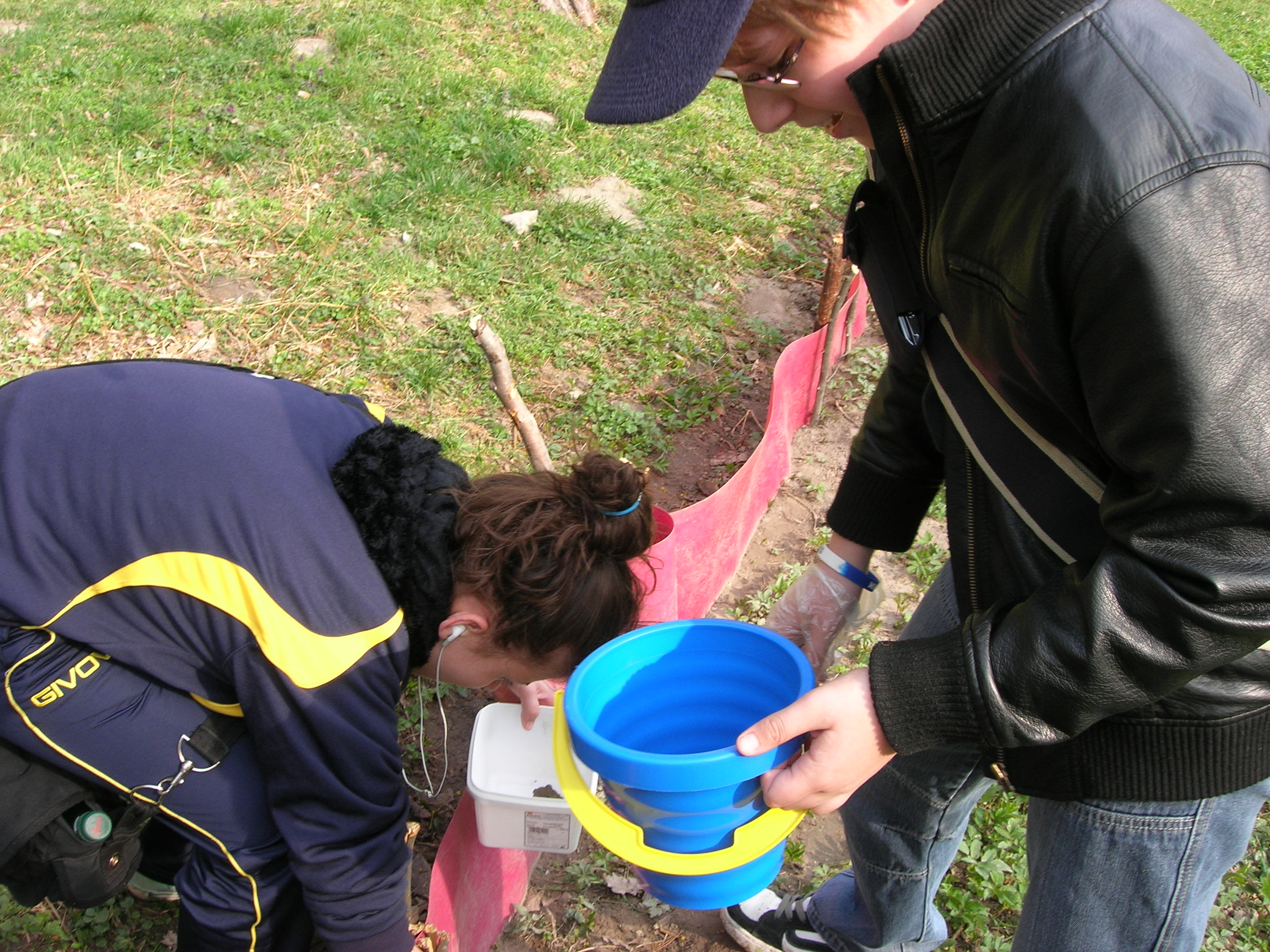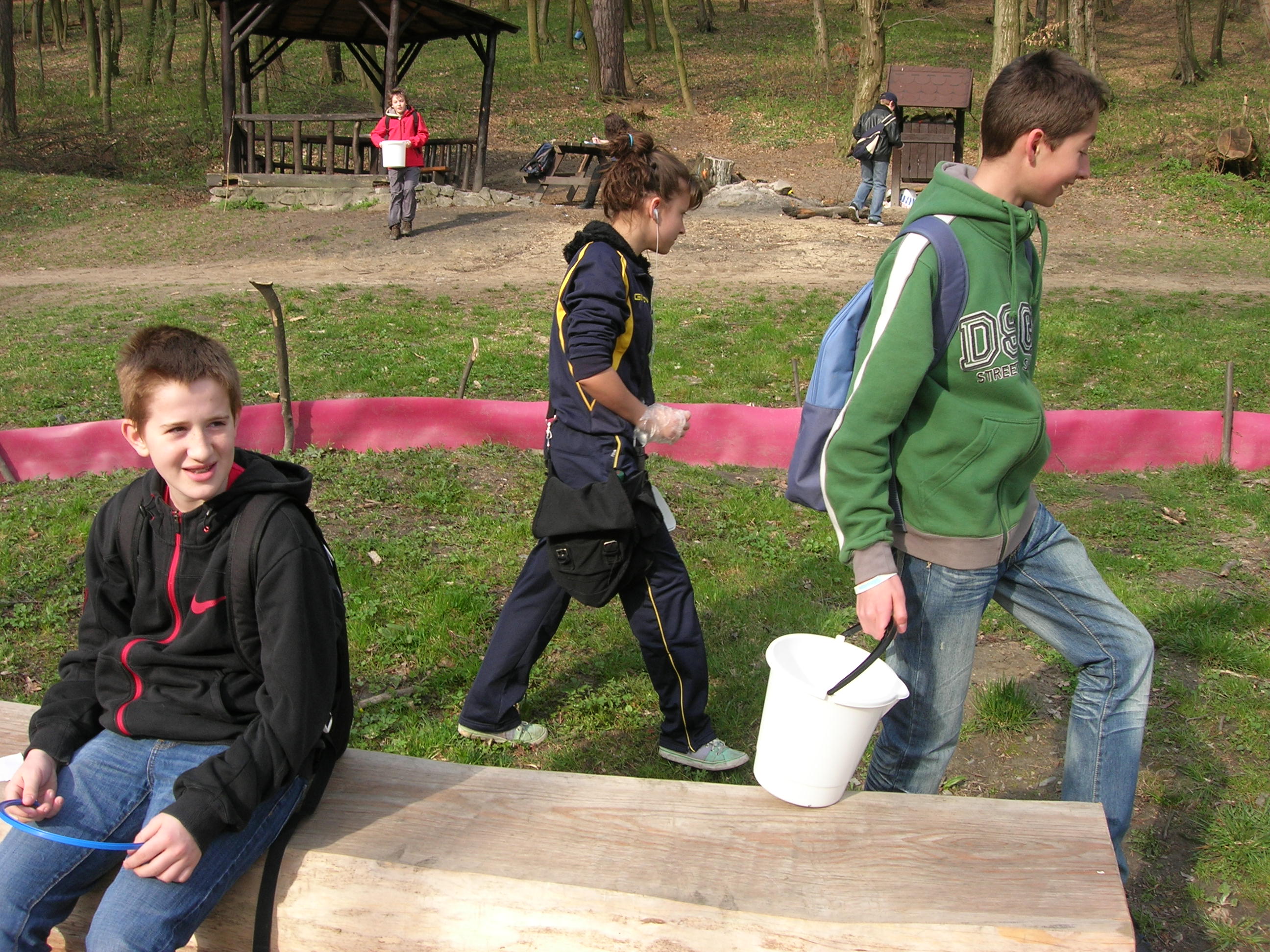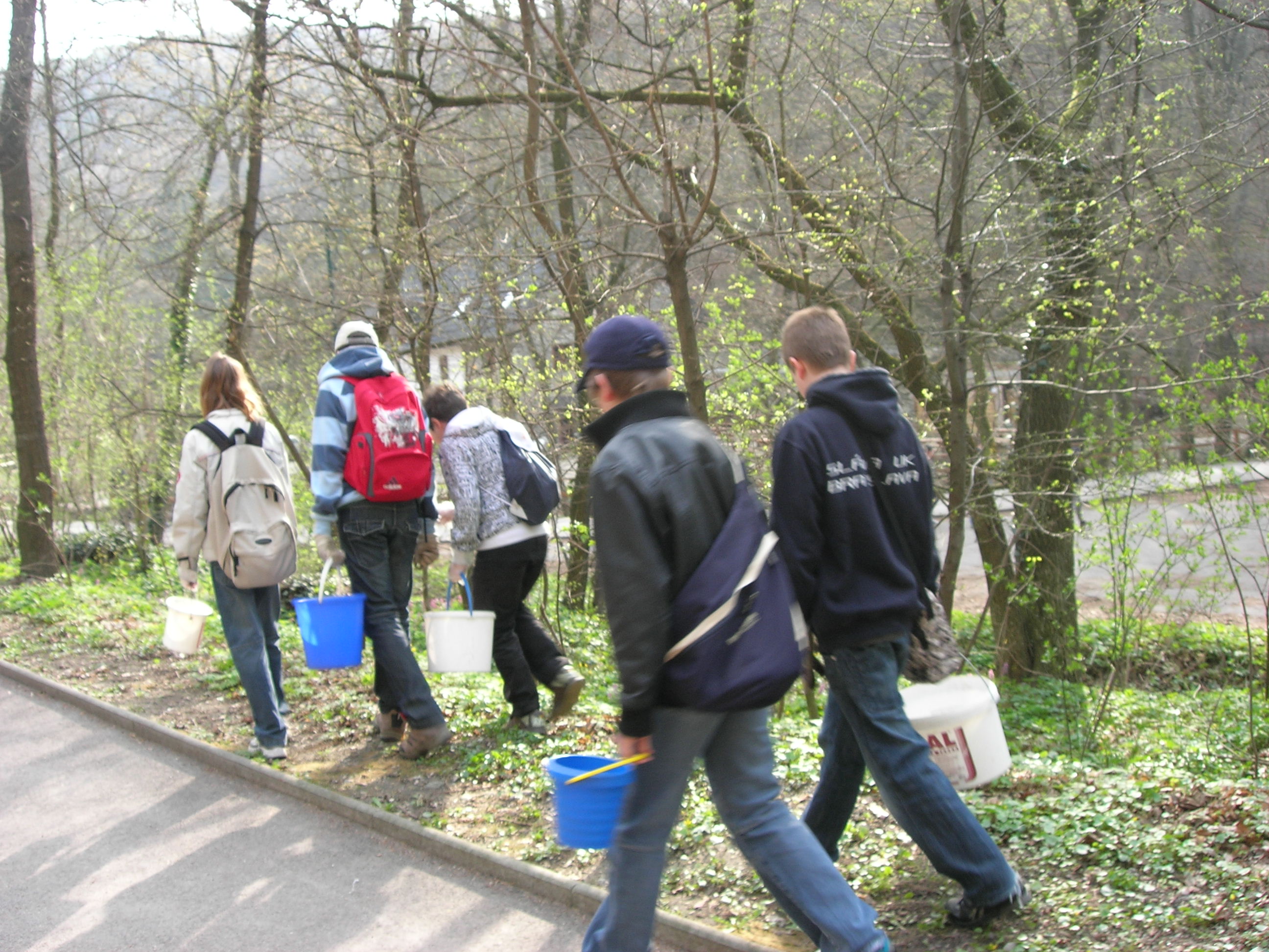 Všetko riadila organizácia Miniopterus a príroda… V polovici marca sa oteplilo. A tak dobrovoľníci postavili popri ceste fóliové zábrany (pomoc pri stavbe je vždy vítaná!). VI. A už mala dohodnutý termín prenášania žabiek, ale žabky nikde. Zrejme ich zabrzdili pomerne nízke nočné teploty a premenlivé počasie. Tak sme sa nakoniec dostali na koniec zoznamu pomáhaniachtivých škôl. A žabky, tak ako váhali so štartom, potom sa nezvyčajne rýchlo presunuli z lesa do vody. 4. apríl, to bol náš deň, lebo už väčšina žiab migrovala späť do lesa. Keďže nás hneď po vystúpení z autobusa privítal nepekný pohľad na pár rozmliaždených žiab na ceste, neváhali sme a začali sme žabky prekladať pekne za cestu, do lesa, tam, kam mali namierené. Niekto holými rukami, niekto v rukaviciach, niekto s jakotom (v lese sa nekričí!) a niekto vôbec.