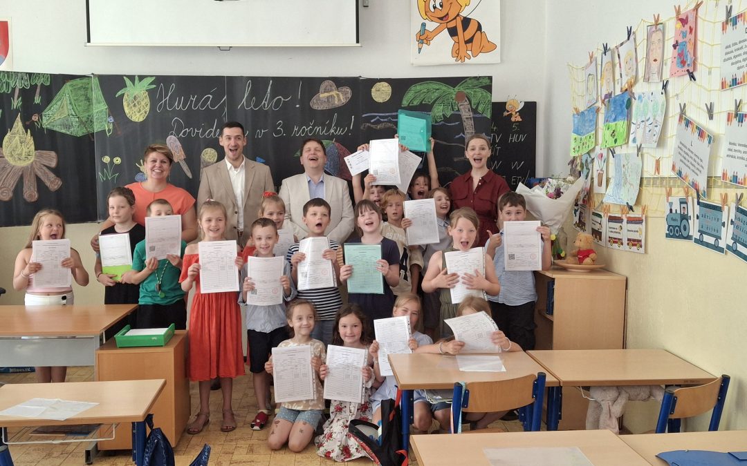 Okrem srdečného stretnutia so žiakmi a pedagógmi prvého stupňa a prechádzky zákutiami nášho školského dvora stihol pán starosta odovzdať vysvedčenia druhákom a absolvovať nespočetné množstvo milých rozhovoroch so žiakmi 1. – 4. ročníka. Tí nelenili a okrem vysvedčenia sa pochválili aj pestrými prázdninovými plánmi.