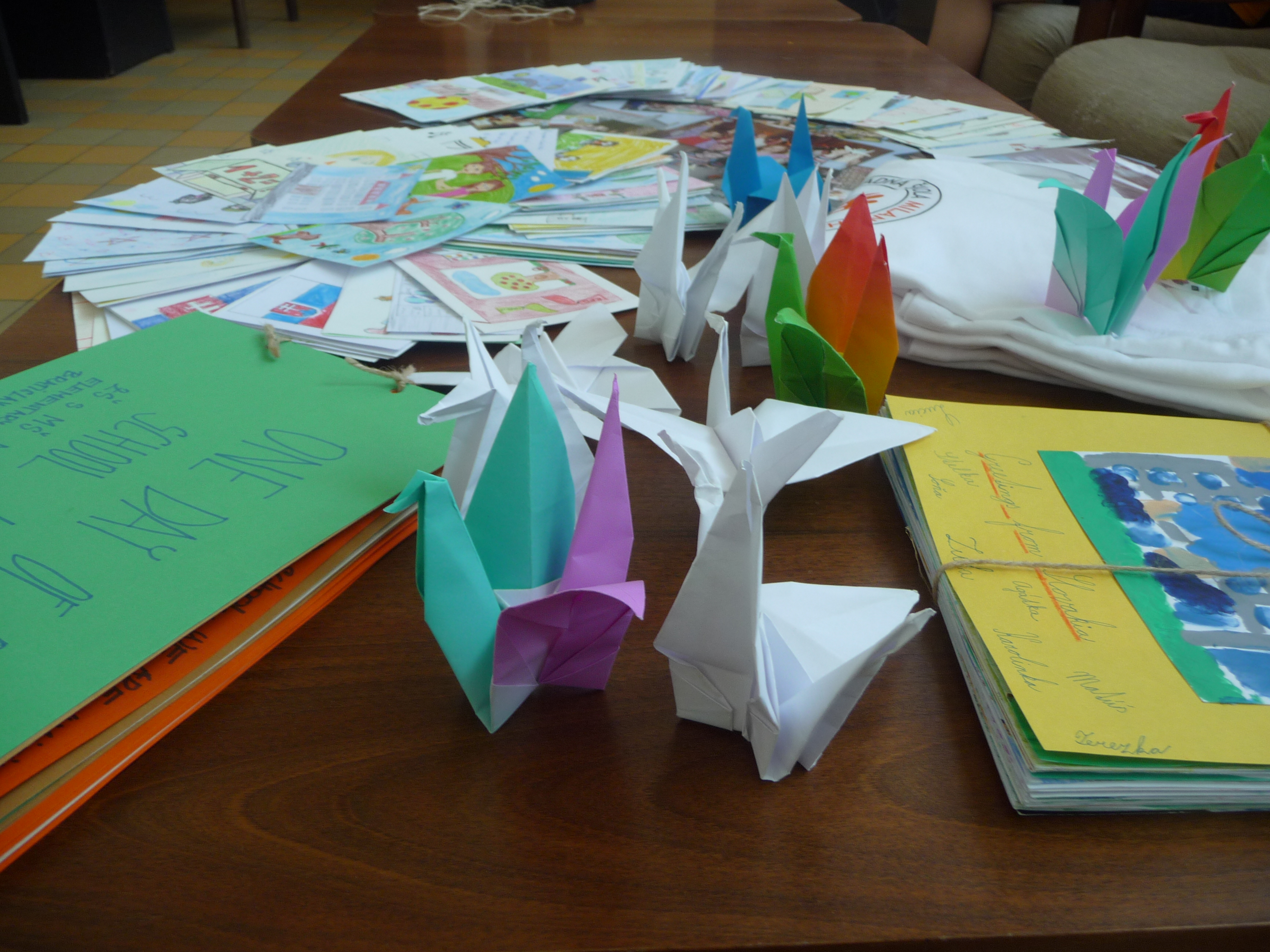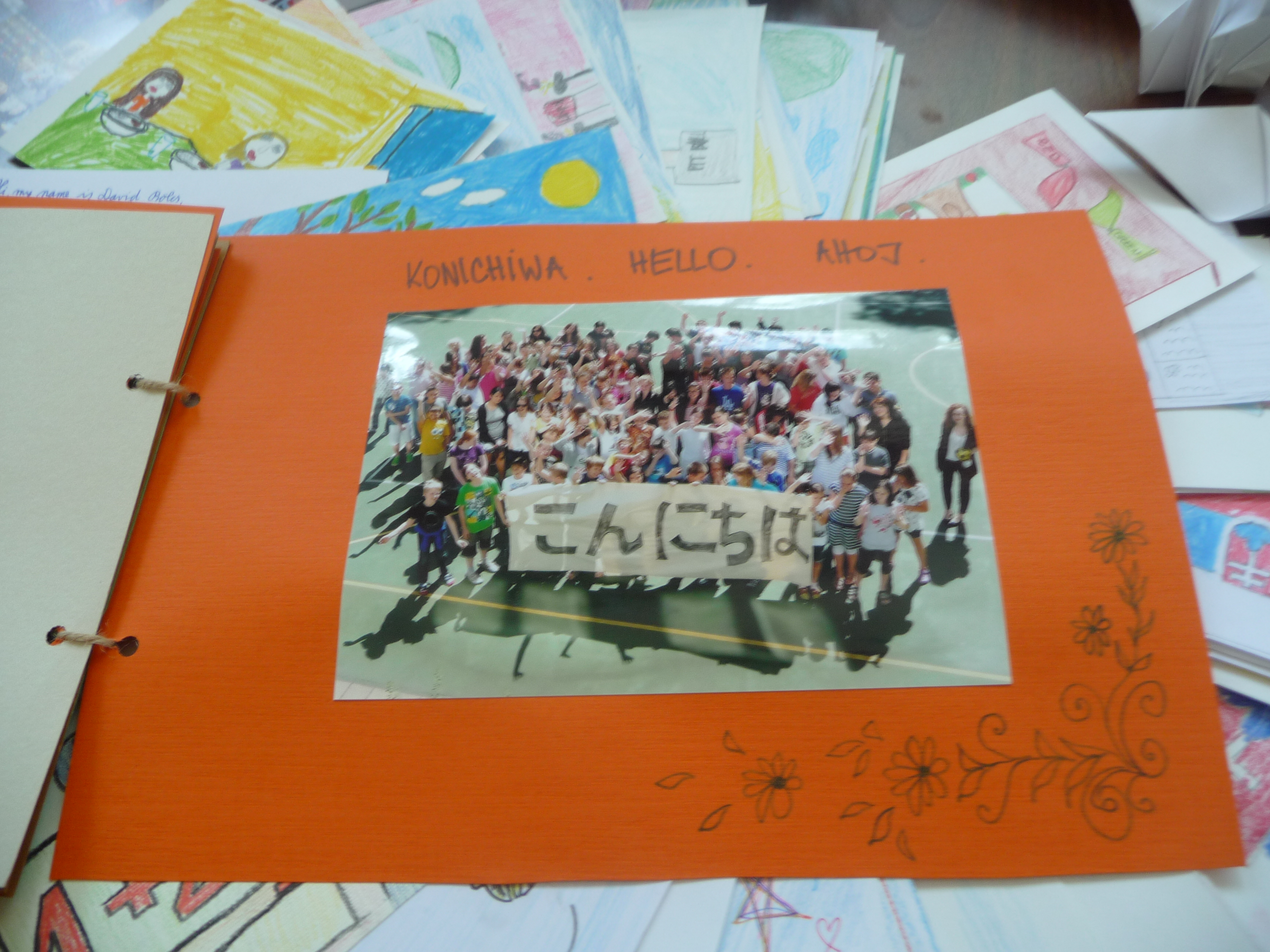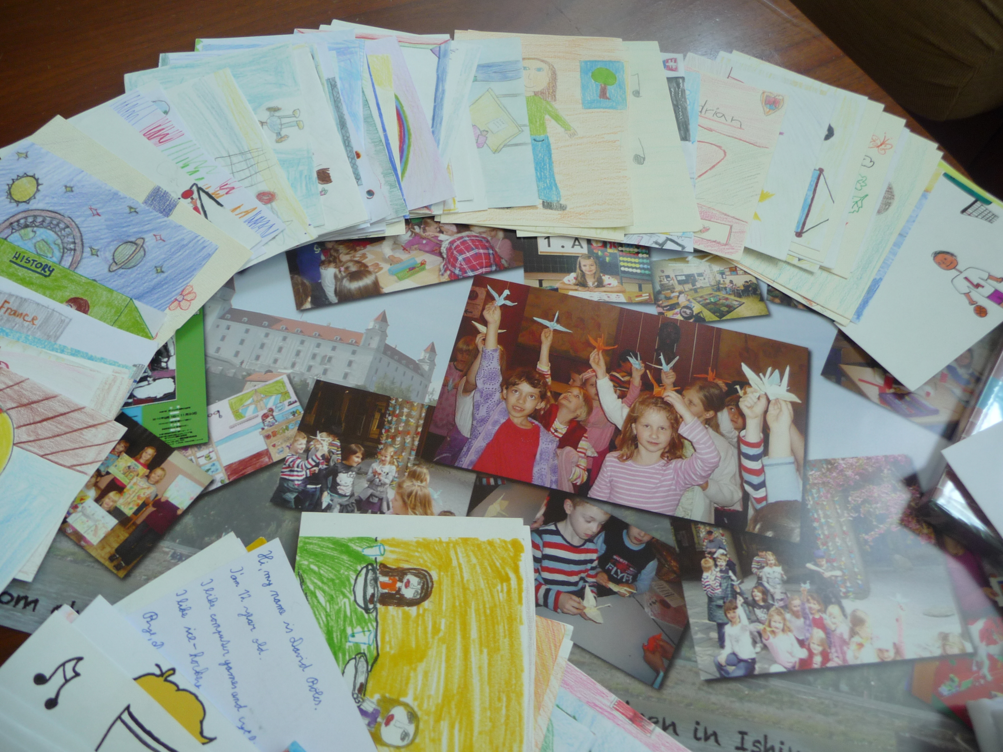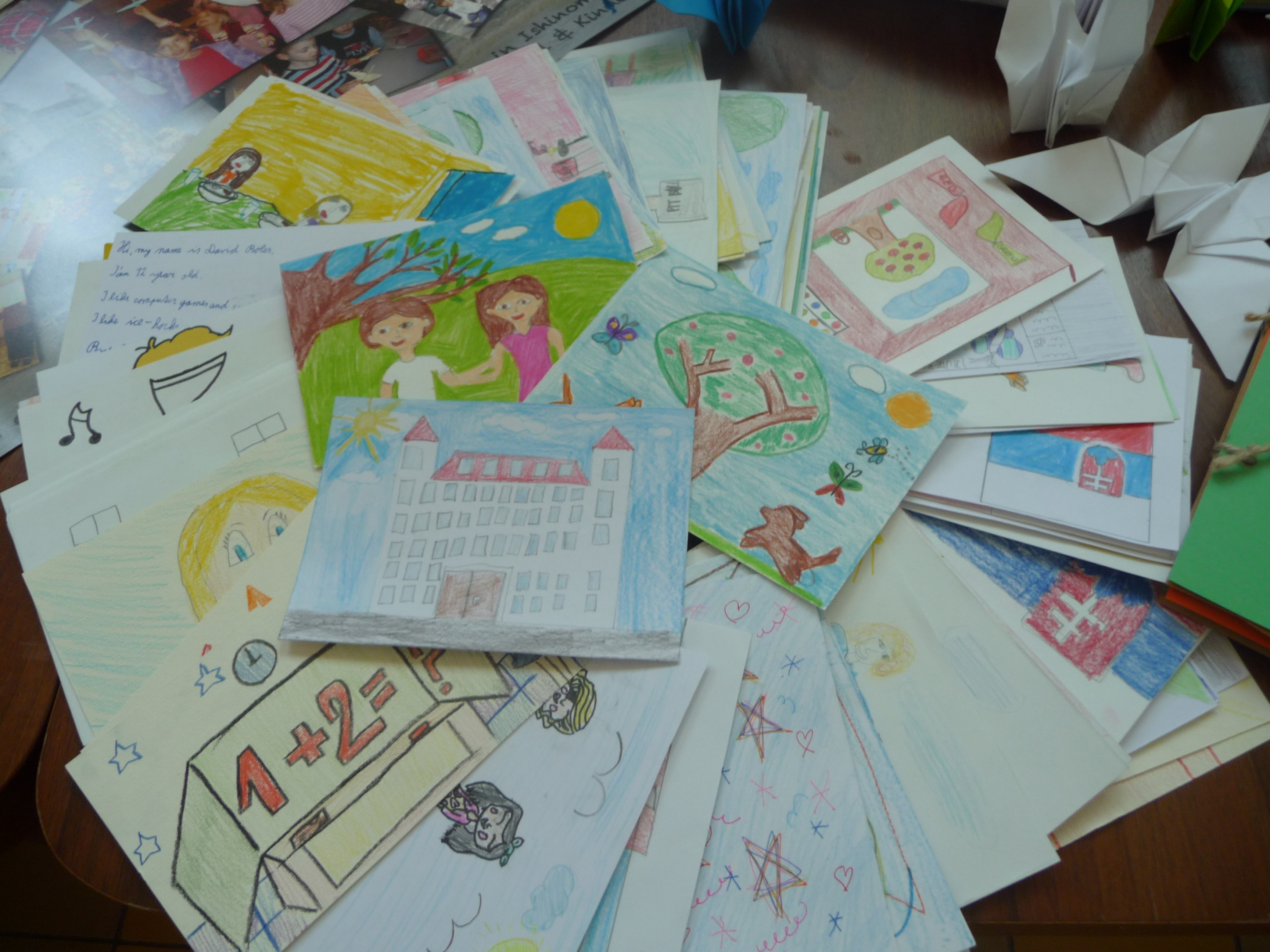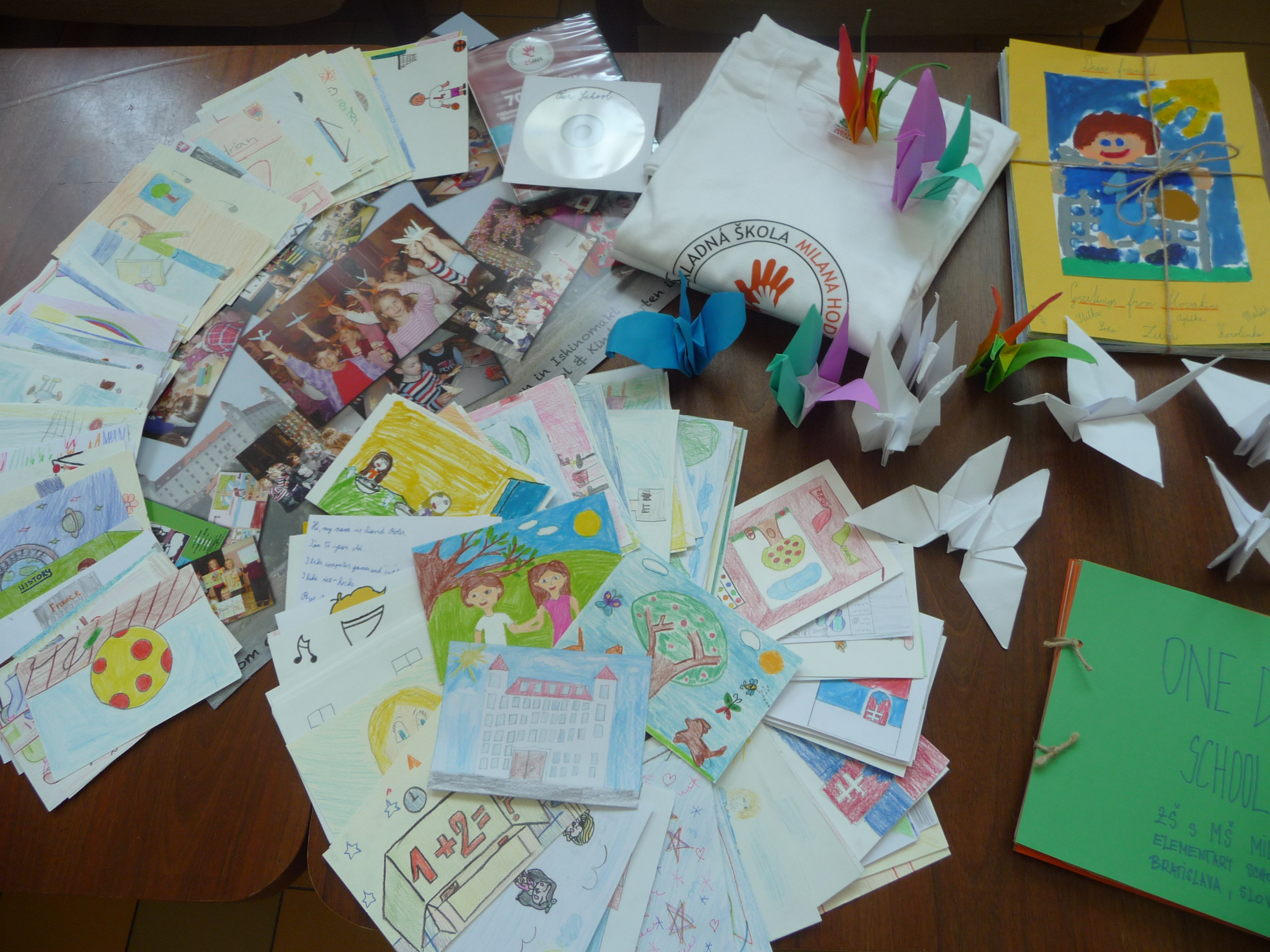 Tak sme sa všetci pustili do práce. Žiaci z nižších ročníkov nakreslili krásne obrázky týkajúce sa hlavne okolia školy a Bratislavy. Vyrobili aj jednu veľkú koláž z fotografií z rôznych školských akcií. Starší žiaci, medzi nimi aj moji spolužiaci a ja, vyrábali origami. Vlastne sme ani netušili, že sa z obyčajného papiera dá vytvoriť toľko odlišných zvierat, kvetov a iných vecí. Ďalej sme kreslili vlastné pohľadnice. Z jednej strany bol obrázok a z druhej krátky text po anglicky, ktorý sme napísali na hodine angličtiny. Následne sme si spravili jednu veľkú fotografiu, na ktorej držíme plagát s japonským nápisom Ahoj. Napokon sa chystáme zostaviť zbierku fotiek, ktorá bude obsahovať nafotené zábery pred školou, cez vyučovanie alebo na záujmových krúžkoch, aby sme deťom v Japonsku priblížili jeden deň zo života našej školy.