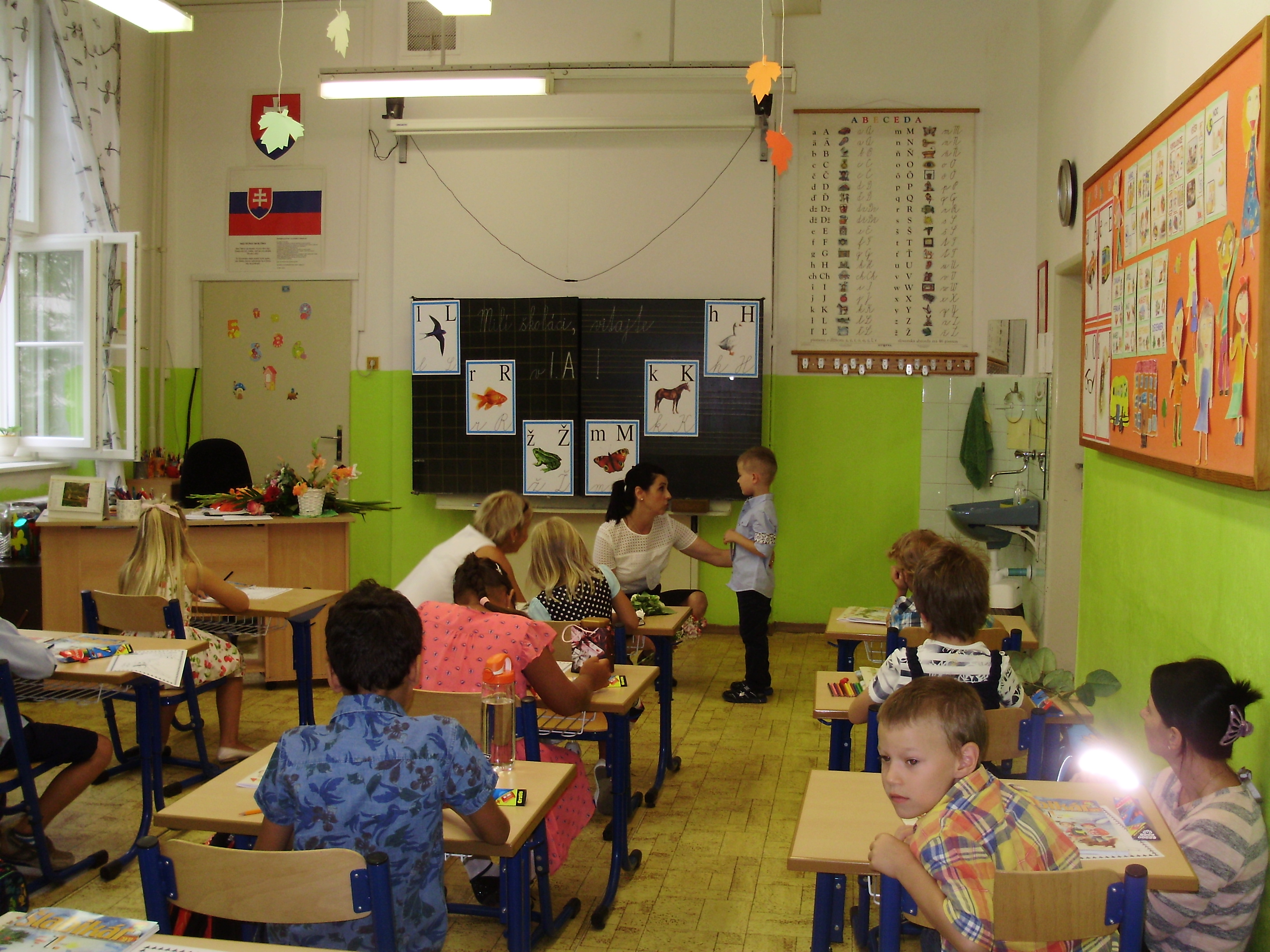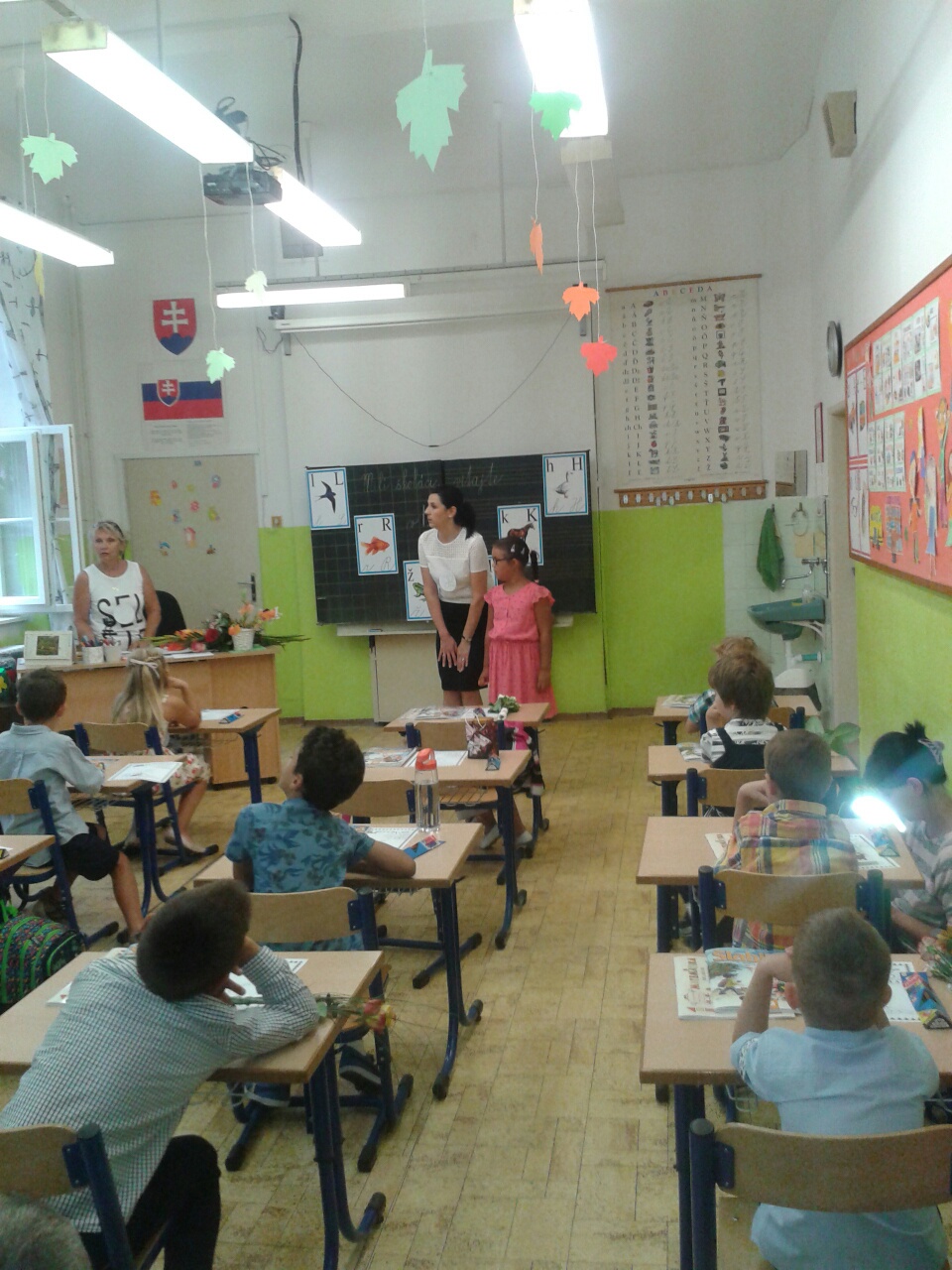Noví školáci, ich rodičia i starí rodičia, pani riaditeľka a pani učiteľky s pani vychovávateľkami – všetci sme sa stretli v telocvični. Starší žiaci pod vedením pani učiteľky Ľubky Benkovej privítali prváčikov milým kultúrnym programom. Pani riaditeľka Hessová sa prihovorila deťom i rodičom. Po jej príhovore sa predstavili triedne pani učiteľky a prečítali mená svojich nových žiakov. Slávnosť pokračovala v nádherne vyzdobených a pripravených triedach.