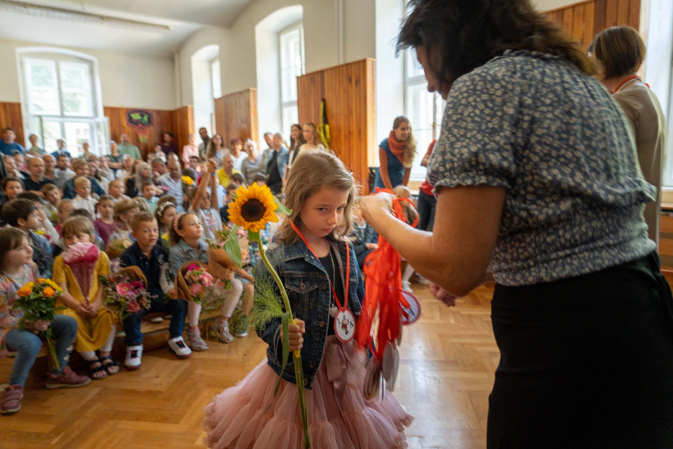 Starší kamaráti ich potešili pekným kultúrnym programom. Po slávnostnom príhovore pani riaditeľky Hessovej deti s rodičmi odišli so svojou novou pani učiteľkou do slávnostne vyzdobených tried, aby sa zoznámili s novým prostredím. Čakali ich tam pekné darčeky a nové učebnice. Našim milým prváčikom želáme, aby ich tváričky aj naďalej zdobil pekný úsmev a želáme im veľa úspechov.