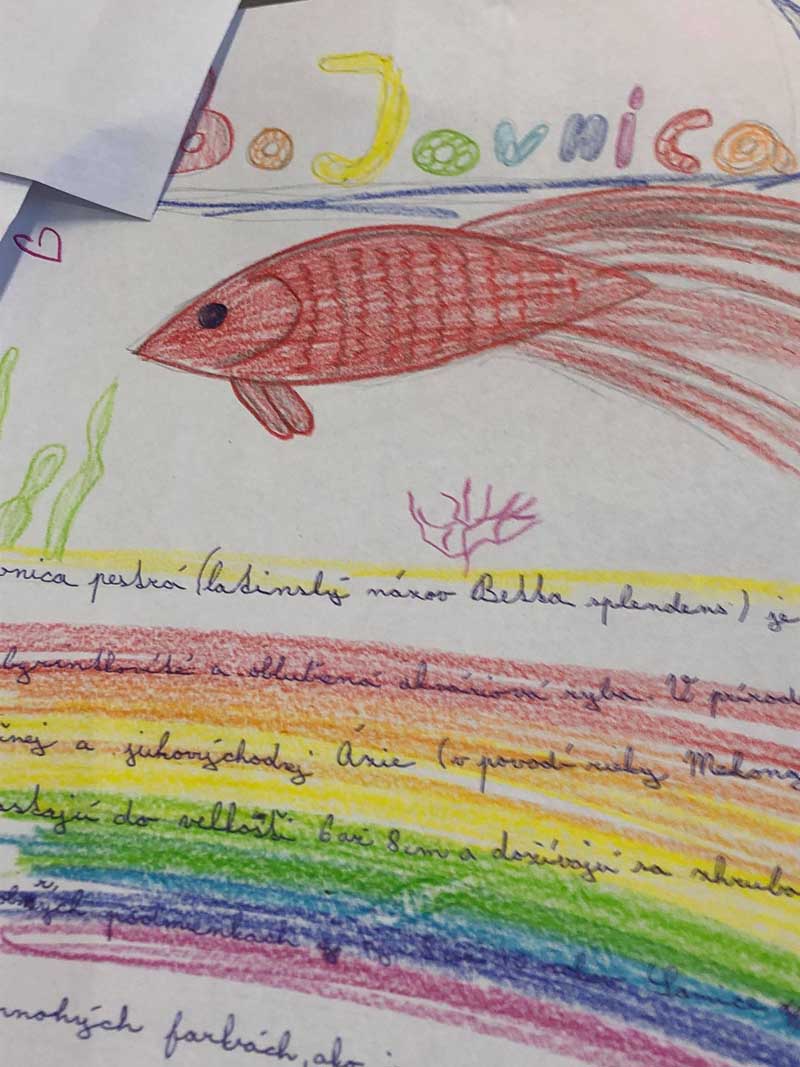 V dnešnej dobe žijeme vo virtuálnom svete. O to viac je potrebné, aby sa deti venovali takým aktivitám, ktoré sú spojené s prírodou. Jednou z nich je aj rybolov. Vďaka rybárčeniu si deti formujú trpezlivosť, férovosť a sebaovládanie. Vášnivých rybárov máme aj v našom školskom klube. Sú to Tomáško Kállay a Miško Szlowinecz zo 4.B, ktorí nám jedno popoludnie spestrili rozprávaním o svojich rybárskych začiatkoch. Ukázali nám potrebnú rybársku výbavu, chytací systém a návnady. Na záver sme si vyrobili akvárium s farebnými rybkami a do triedy sme tak dostali kúsok prírody.