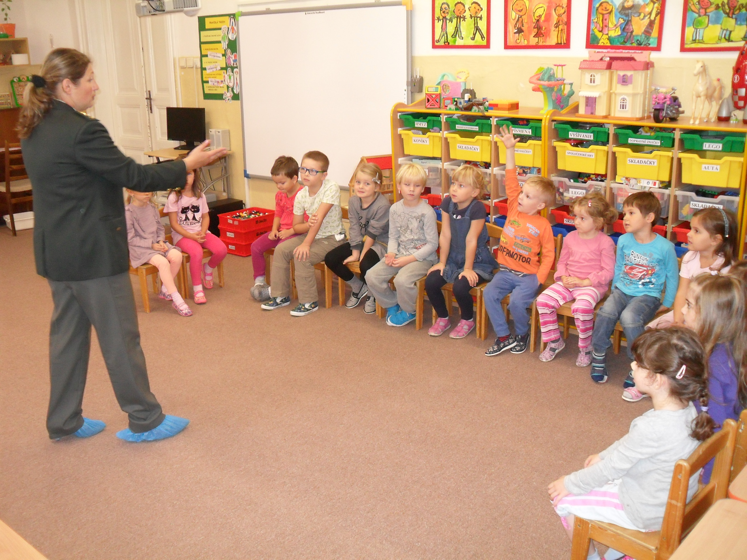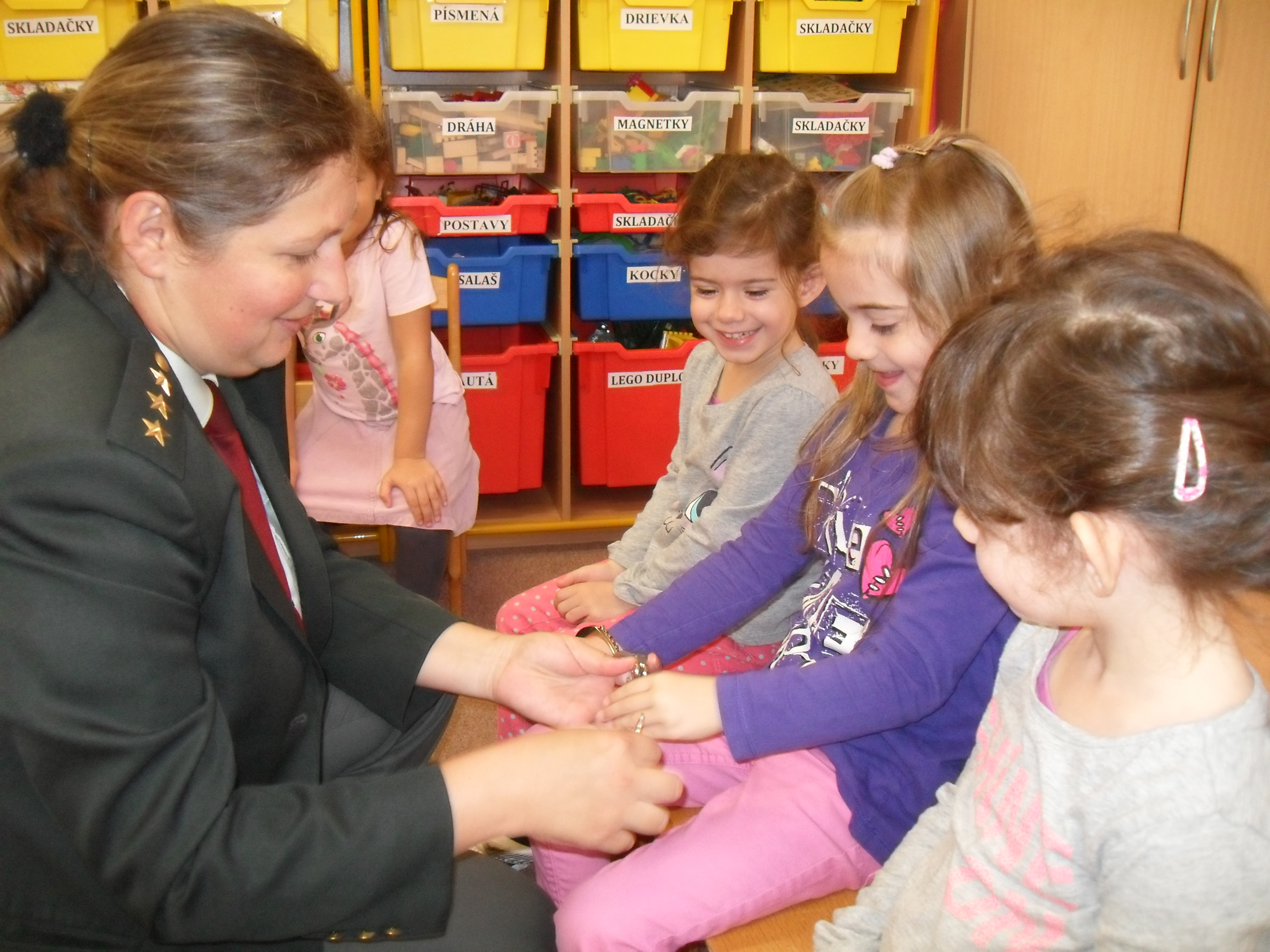 Pani preventistka Jana Ďurkovičová je policajtka. Prišla deťom porozprávať o svojom povolaní.  Poučila ich, že dôverovať cudzím ľuďom môže byť veľmi nebezpečné.