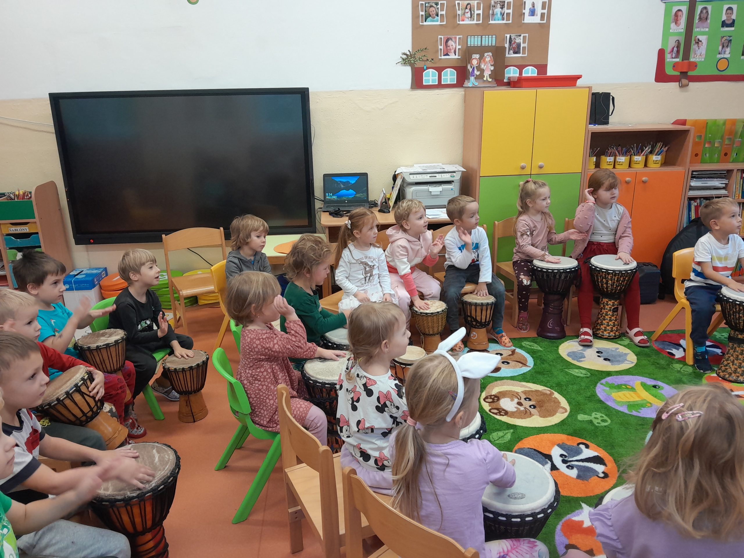 V prvú októbrovú stredu zažili naše Žabky a Sovičky v materskej škole netradičné hudobné muzicírovanie. Navštívil nás pán Janko Boldiš z bubnovej školy Rytmika, aby našich škôlkarov zoznámil aj s menej známymi hudobnými nástrojmi. Najväčšou radosťou pre nás bolo, že sme si mohli hru na ne vyskúšať, vďaka čomu sme vytvorili netradičnú škôlkarsku kapelu.