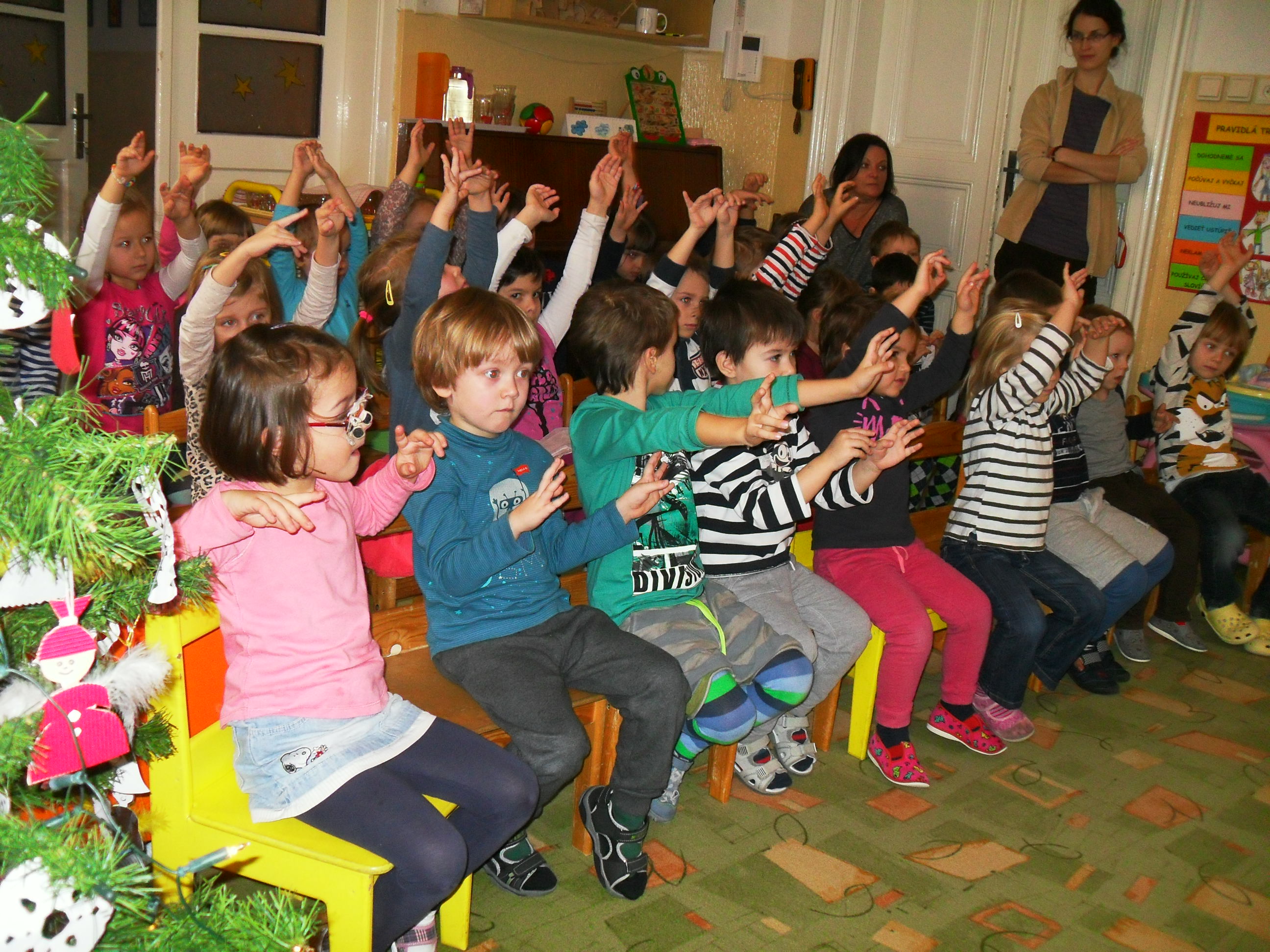 Pani Vločka nám rozprávala svoje príhody z detstva o tom, ako sa slávili Vianoce kedysi. Rozprávanie bolo plné tradícií a nesmeli chýbať vianočné koledy Tichá Noc, Ježiško hajaj a spi a Nesiem Vám Noviny. Predstavenie obohacovali hudobné nástroje, vďaka ktorým mali deti krajší zážitok. Popriali sme si krásne prežitie vianočných sviatkov a všetko dobré v novom roku.