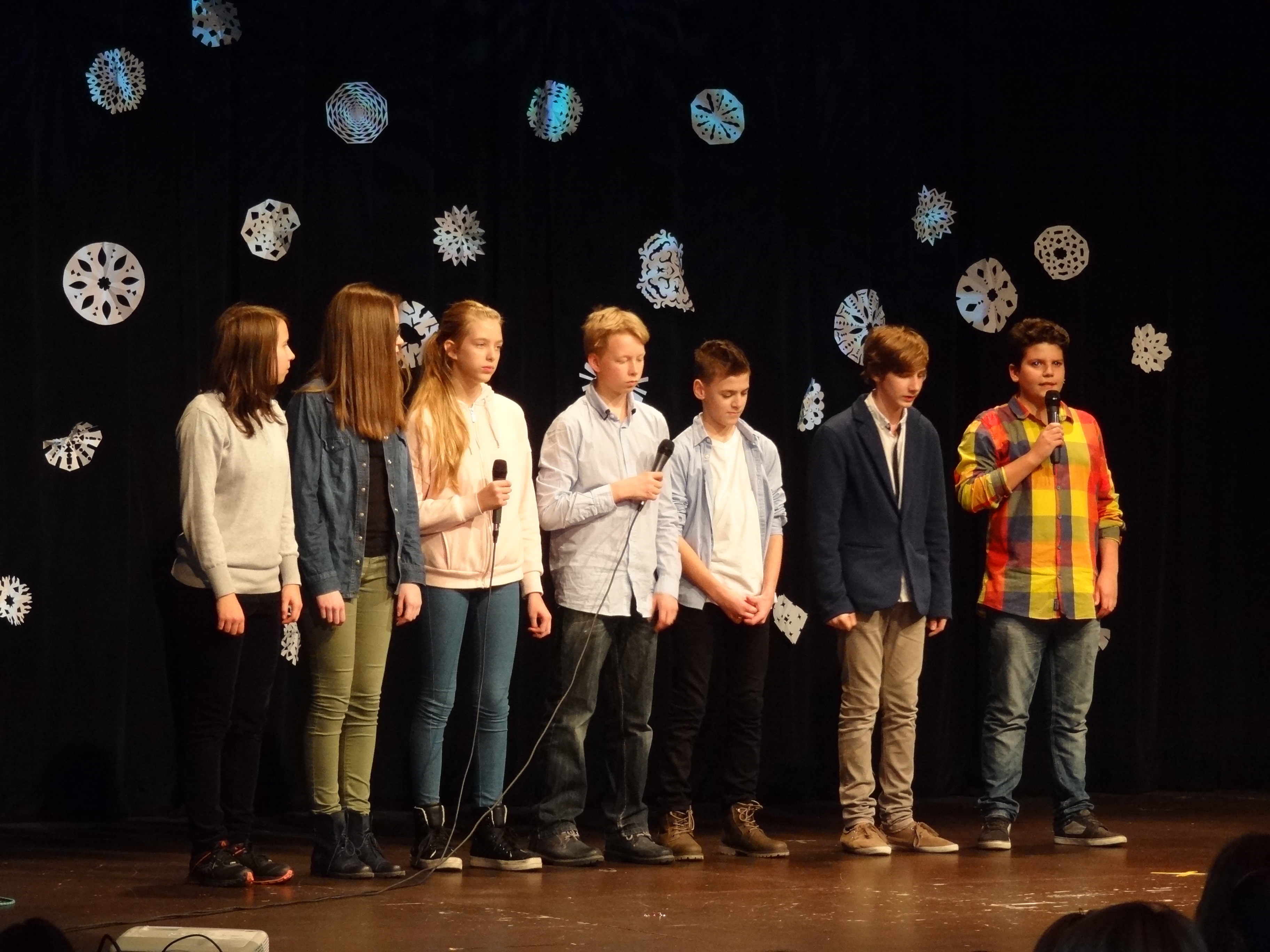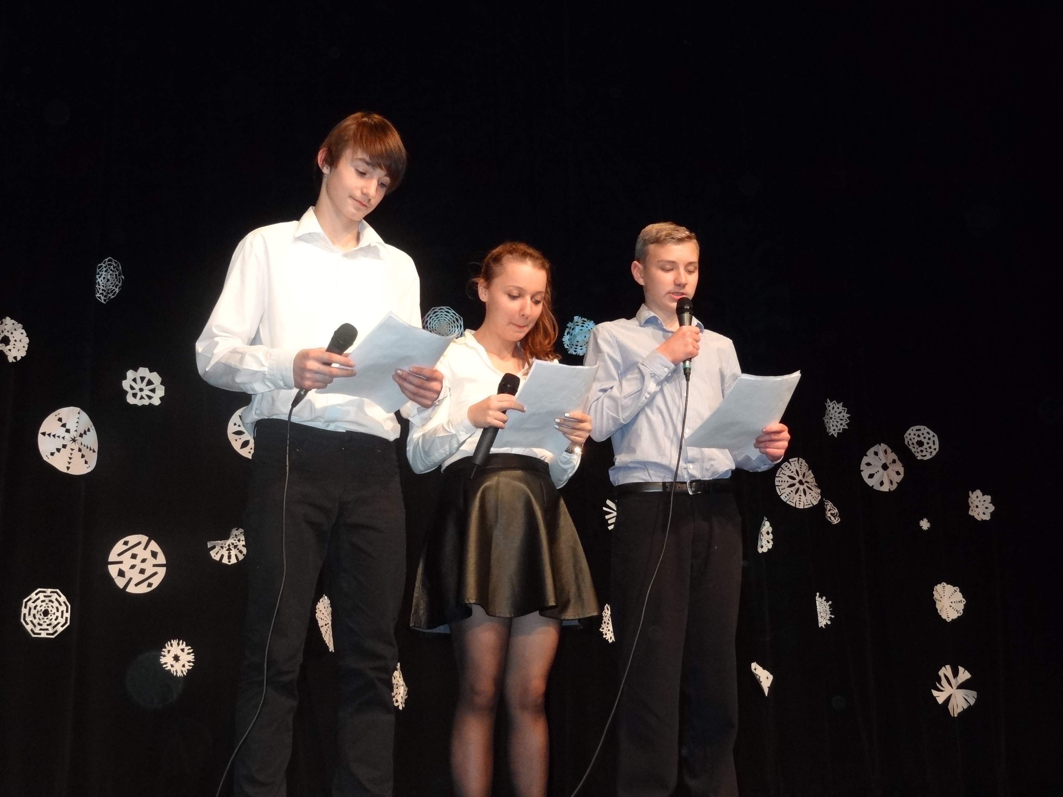 Po pásme Európske Vianoce nám chvíľku zamyslenia nad skutočným posolstvom Vianoc priniesla poézia. Vianočnú báseň nám zarecitovali žiačky 6.B Tatiana Plavecká a Alexandra Csoltiová a báseň Daniela Heviera Vianočná pošta kolektív žiakov 6.A. Slovenskú tradičnú koledu nám zaspievali žiaci 6.B spolu. s pani učiteľkou Lukčíkovou. Na záver účinkujúci spolu zaspievali pieseň Vianočný zázrak.