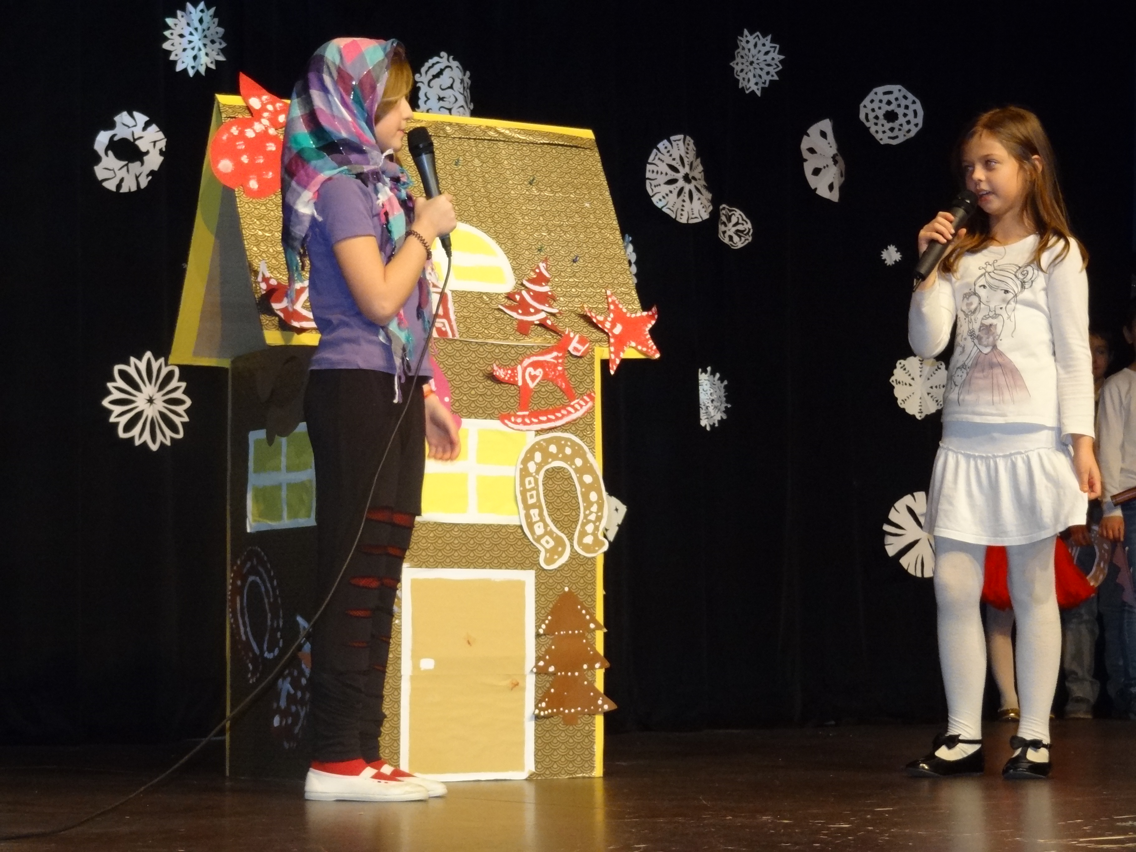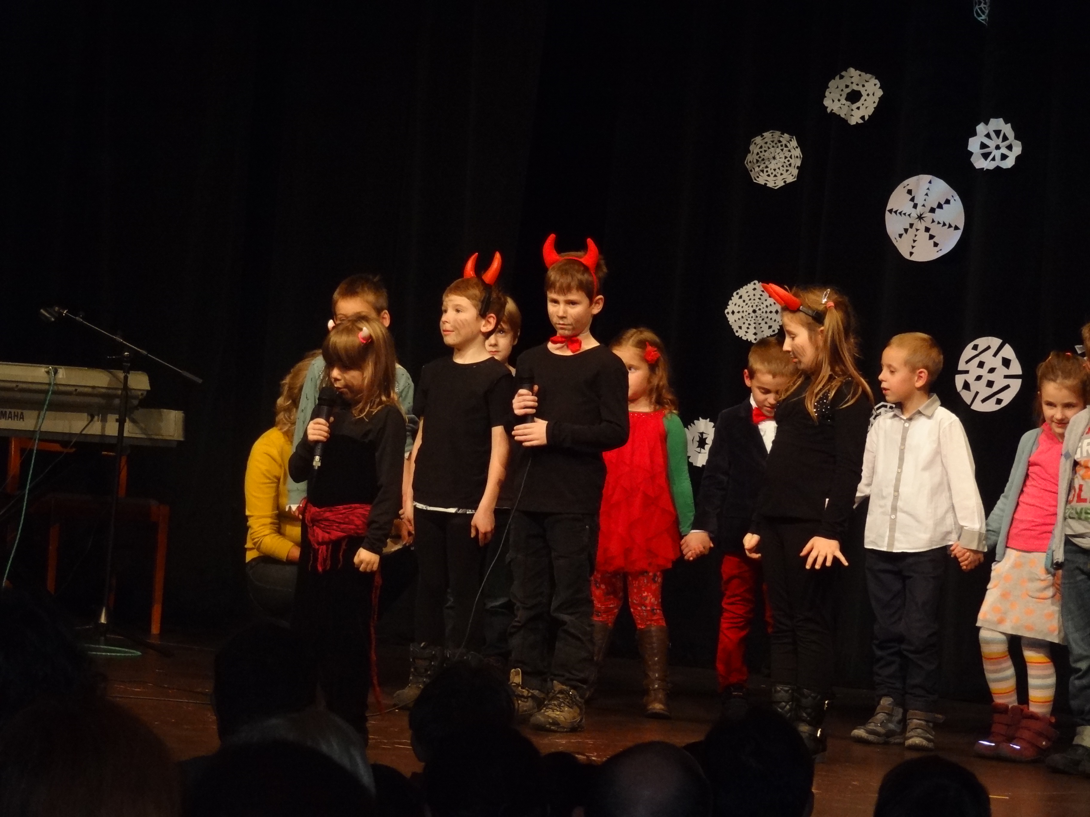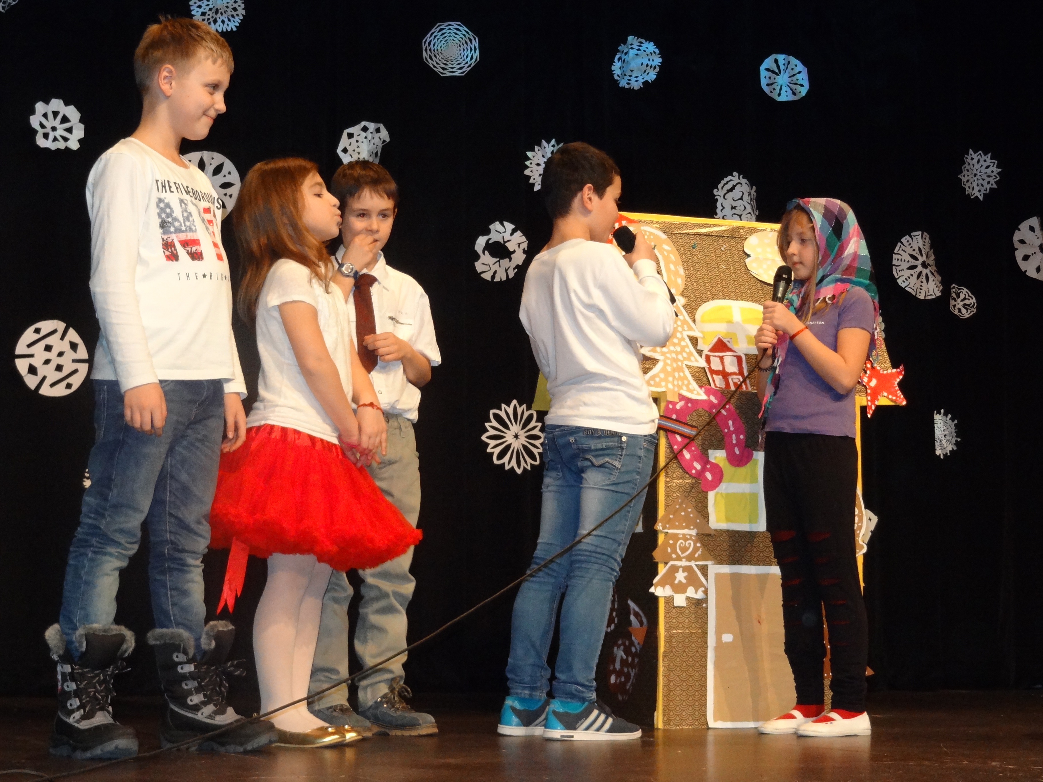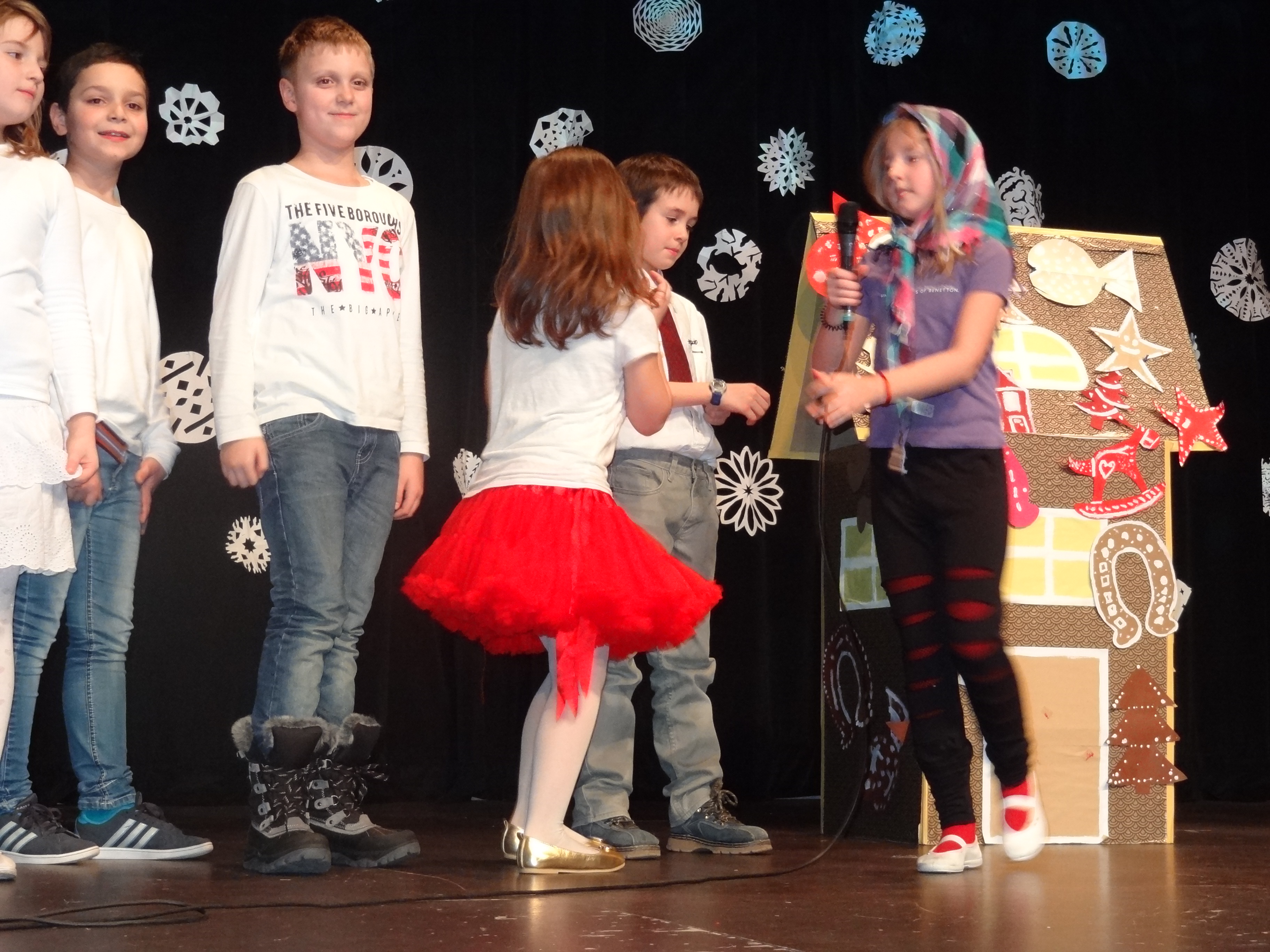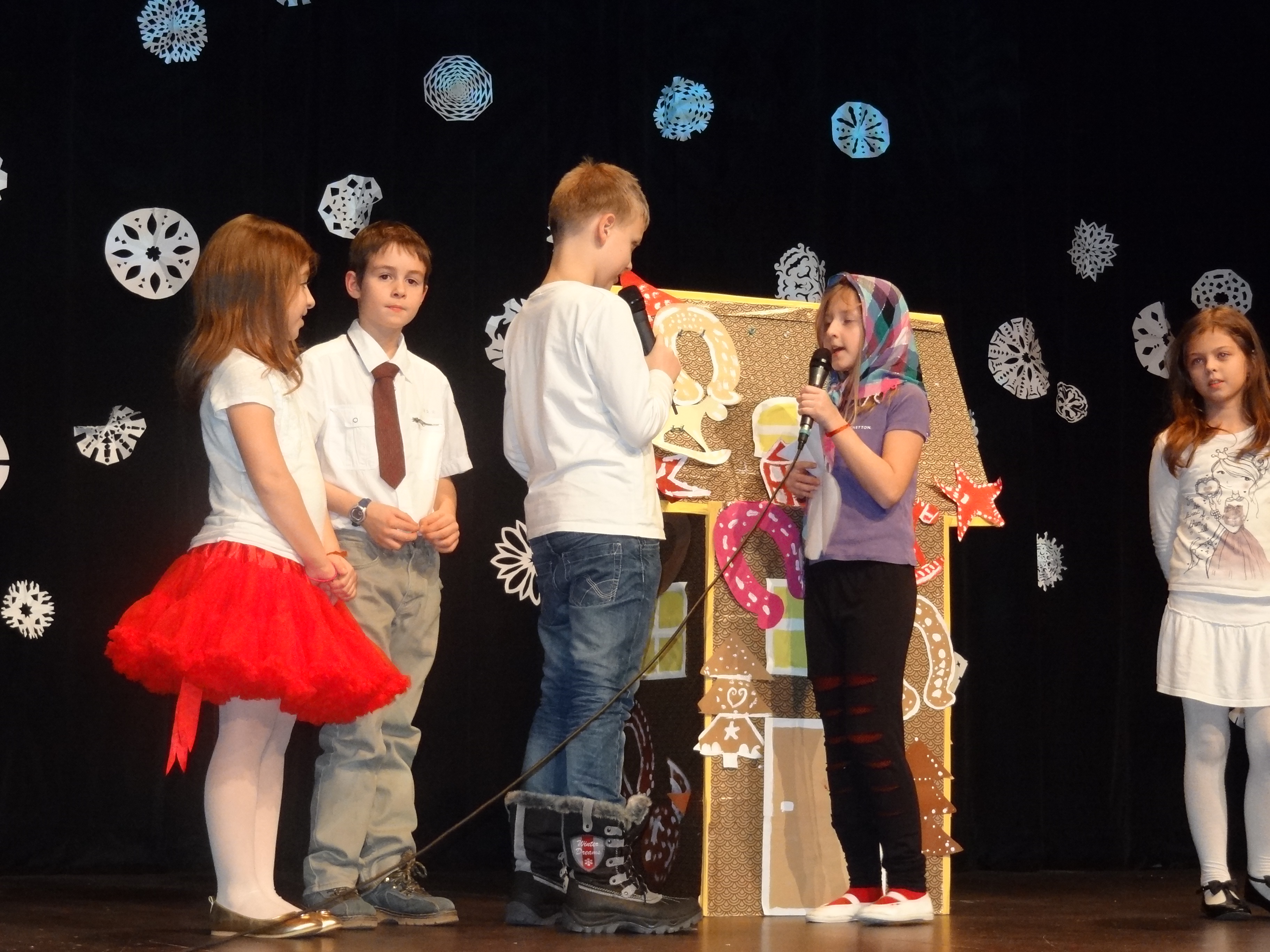 Obzvlášť milú a veselú atmosféru do tohto podujatia vniesli vystúpenia 1.stupňa.Divaci sa mohli tešiť z humornej scénky Nevďačné deti a Vianoce žiakov 2.A, z piesne Pastuškovia od detí 2.B, z piesne Vianoce, Vianoce od Petra Nagya v podaní žiakov 1.C, z piesne Už je zima, už je tu a zo scénky Štyria čerti v podaní triedy 1.A, z moderného tanca detí 1.B a z triedy 3.B vo veselej pesničke Trpaslíci a v kolede Tichá noc. Nechýbali ani k Vianociam neodmysliteľne patriace rozprávky. 3.B nám zahrala Medovníkový domček a 4.B Šípkovú Ruženku.