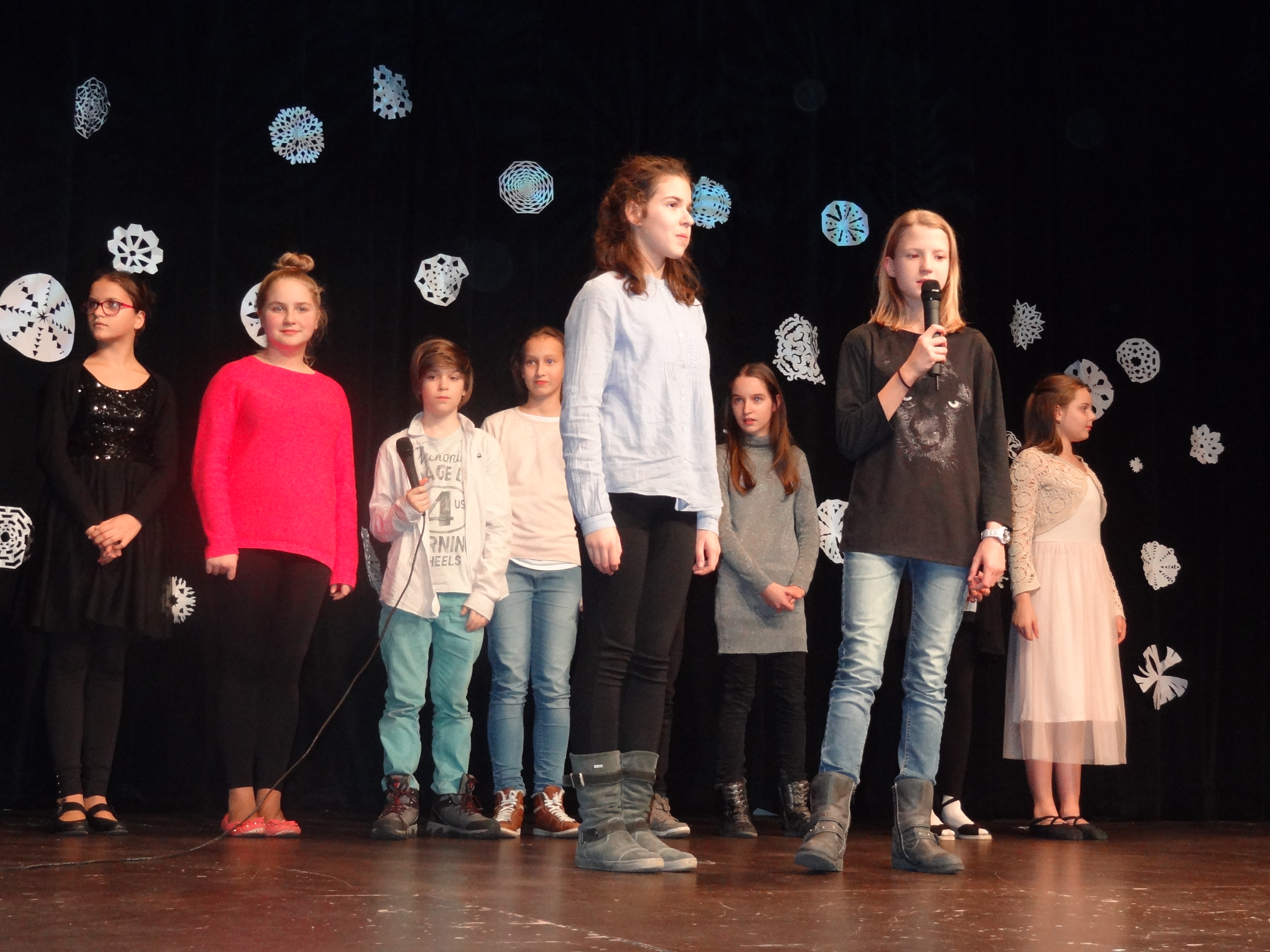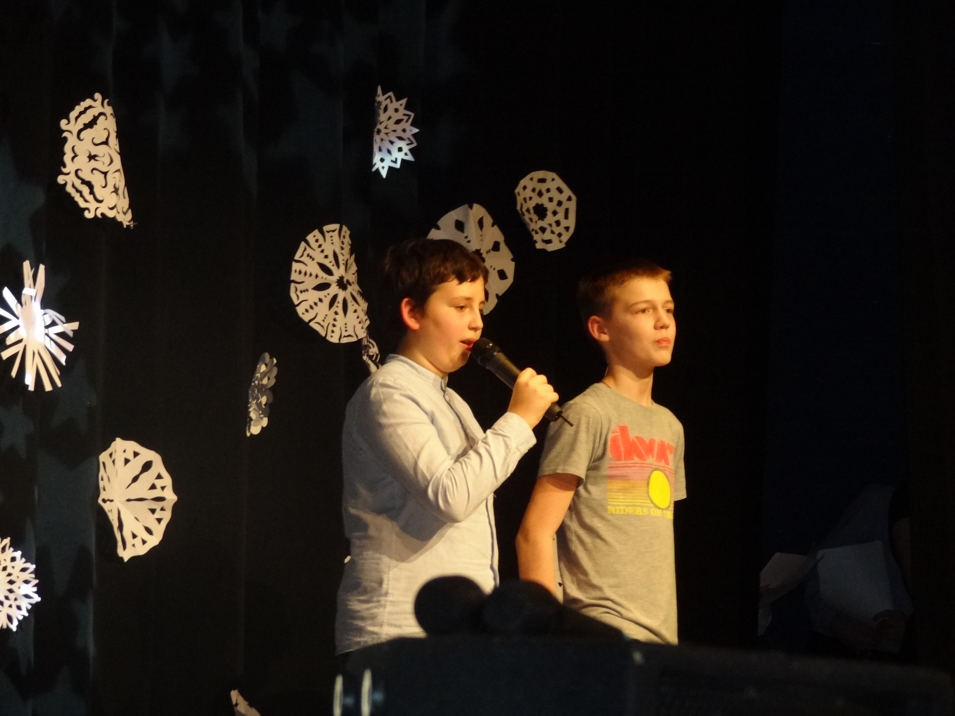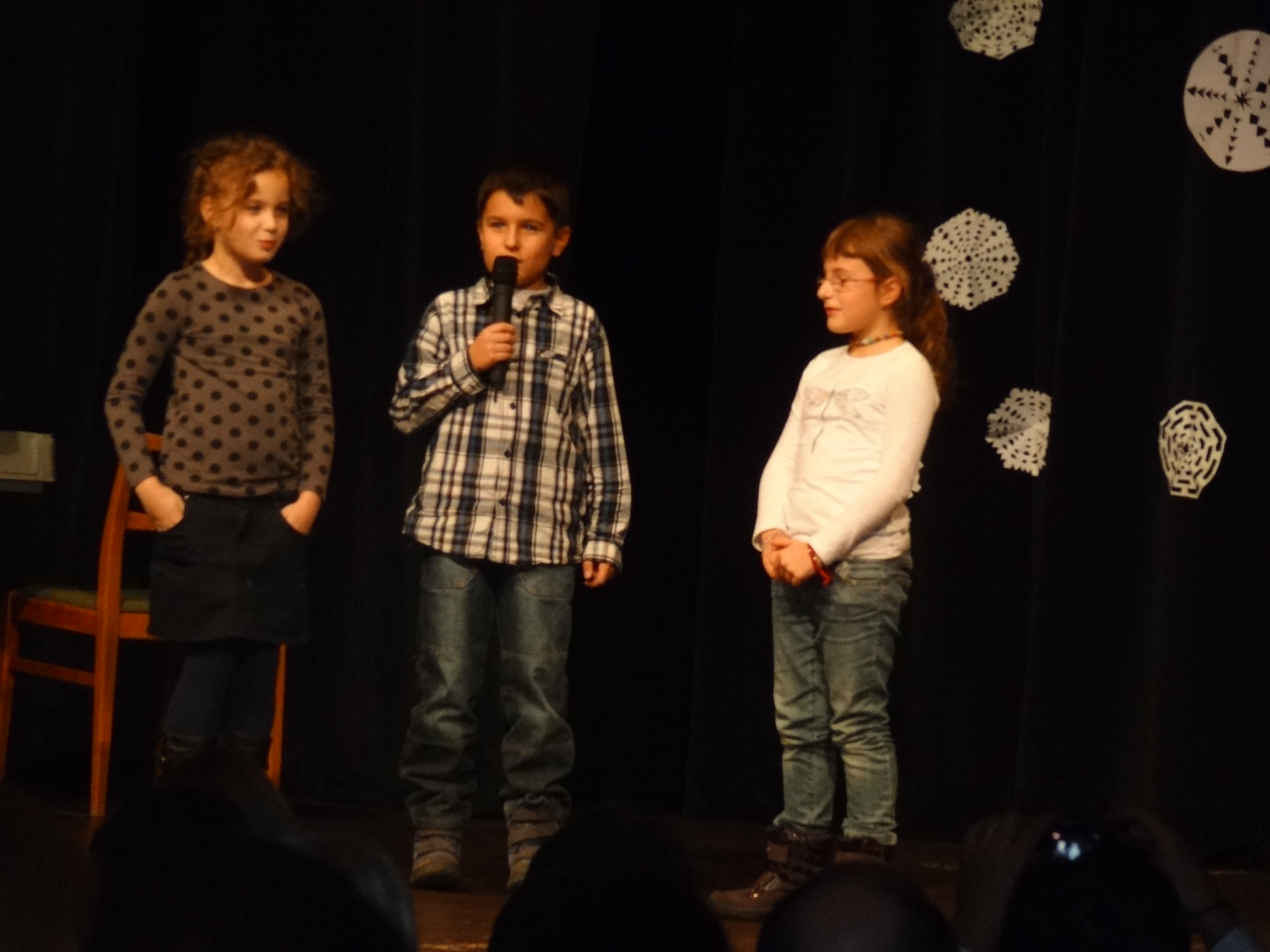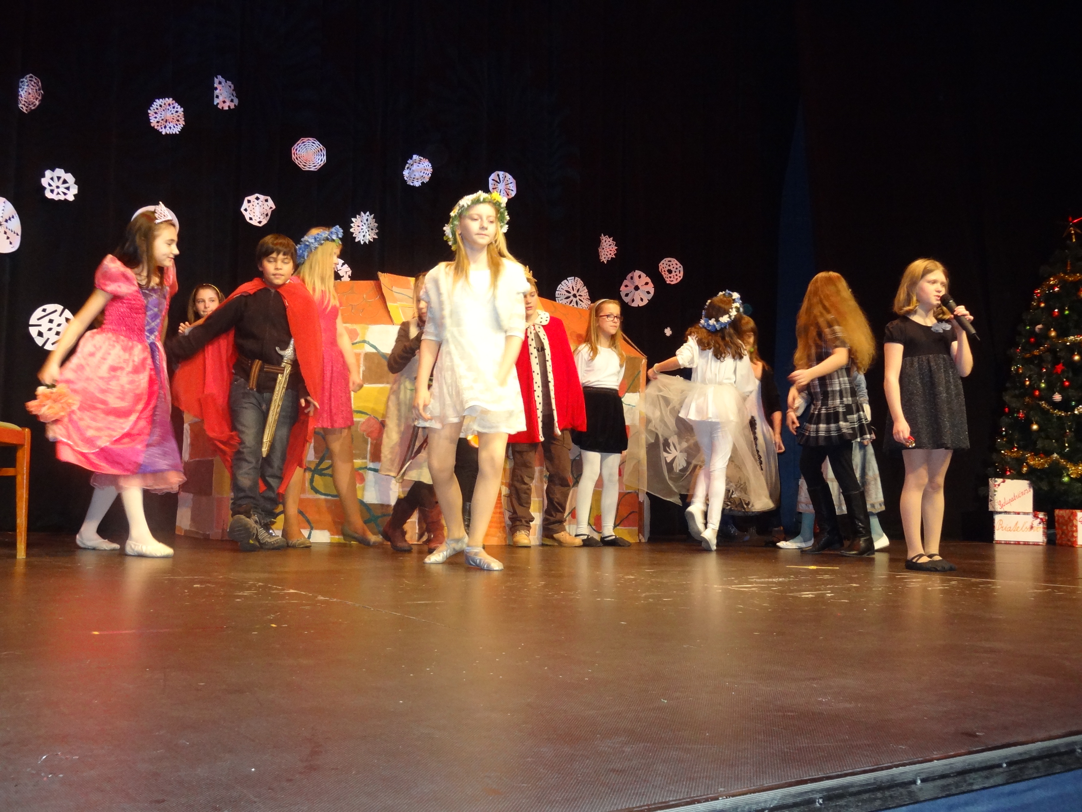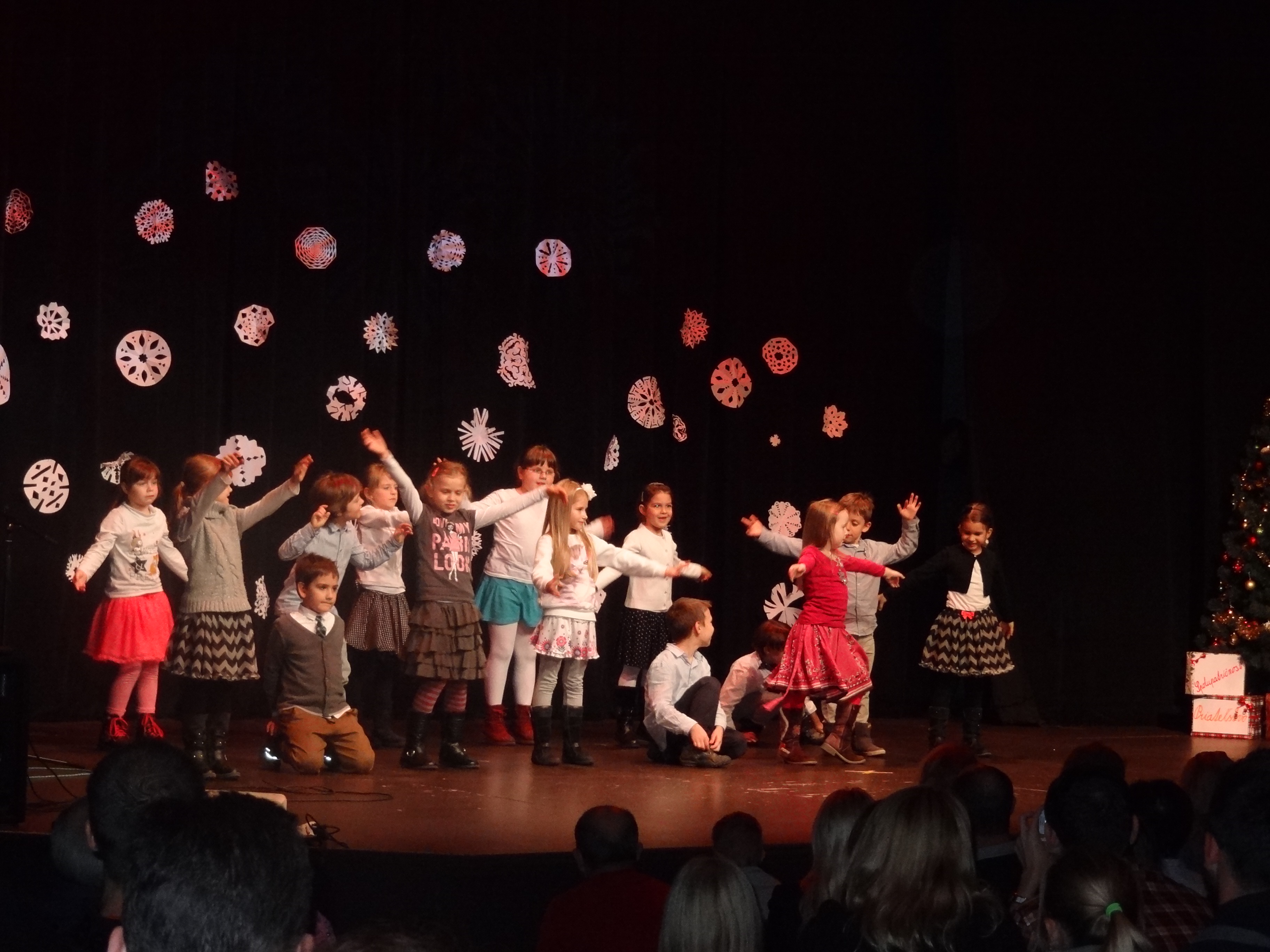 Obzvlášť milú a veselú atmosféru do tohto podujatia vniesli vystúpenia 1.stupňa.Divaci sa mohli tešiť z humornej scénky Nevďačné deti a Vianoce žiakov 2.A, z piesne Pastuškovia od detí 2.B, z piesne Vianoce, Vianoce od Petra Nagya v podaní žiakov 1.C, z piesne Už je zima, už je tu a zo scénky Štyria čerti v podaní triedy 1.A, z moderného tanca detí 1.B a z triedy 3.B vo veselej pesničke Trpaslíci a v kolede Tichá noc. Nechýbali ani k Vianociam neodmysliteľne patriace rozprávky. 3.B nám zahrala Medovníkový domček a 4.B Šípkovú Ruženku.
