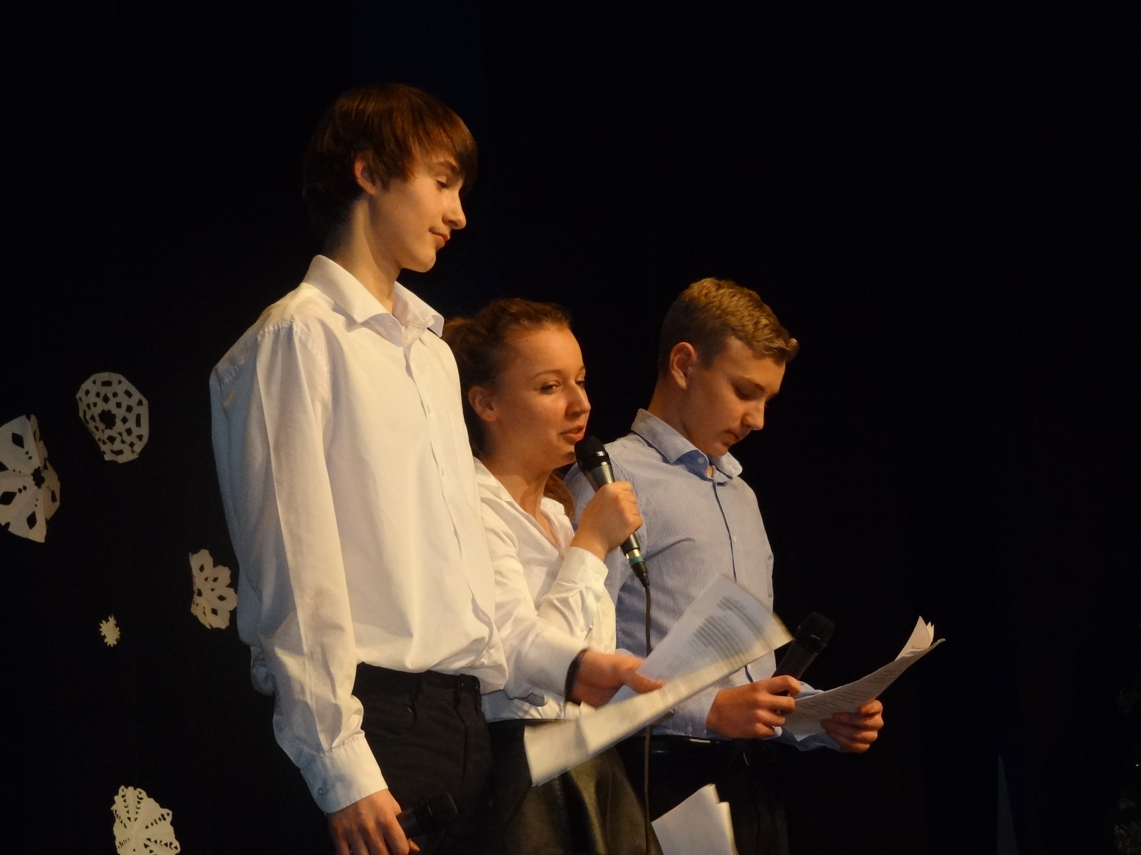 Na príjemne strávený večer nás hneď v úvode naladilo husľové sólo Kristíny Blahovej. Hneď po ňom privítali naši šikovní moderátori Ema Prejsová, Sebastián Horký a Filip Škorec divákov a nasledovalo pásmo venované Milanovi Rúfusovi.