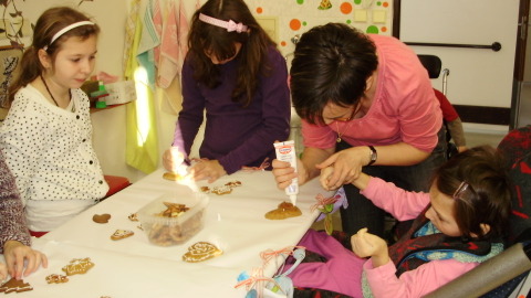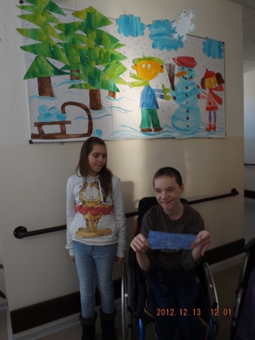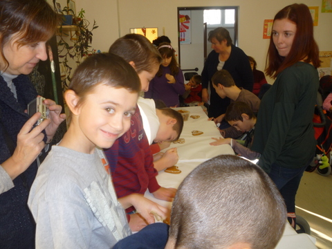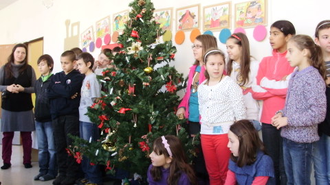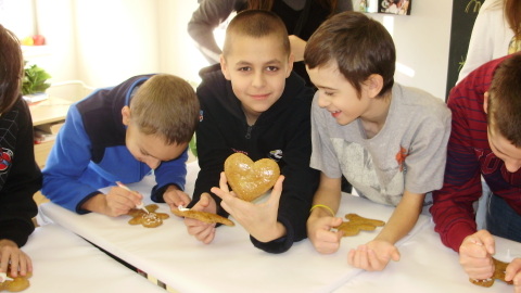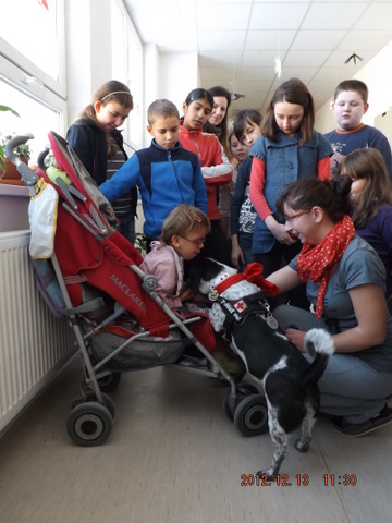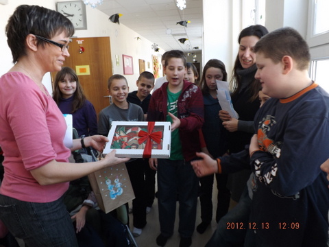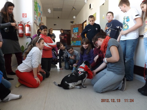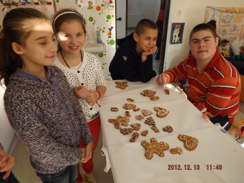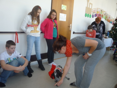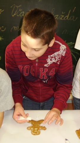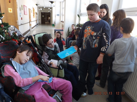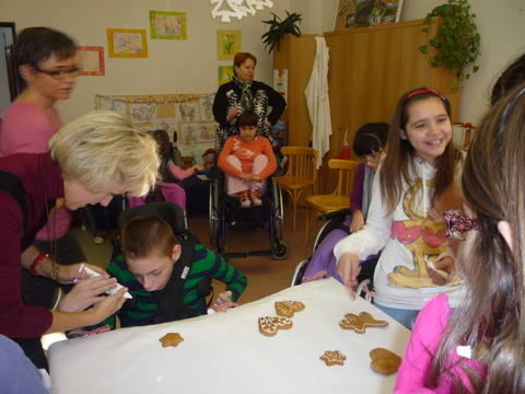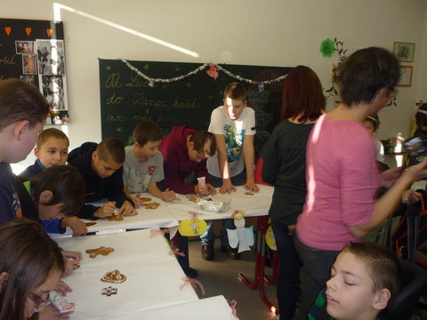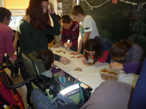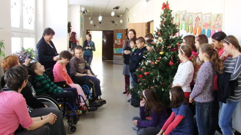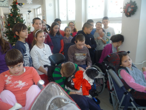 Mirka a Filipko nám zaspievali koledy a my sme im zaspievali pieseň Som žiak 5.B na melódiu Jingle Bells. Neskôr sme spoločne ozdobovali perníčky. Psík Natálka nám ukázal, čo vie, dokonca aj počítal. Darovali sme im obrázky, ktoré sme pre nich vyrobili na výtvarnej výchove. Pripravili si pre nás aj malé pohostenie. Našli sme si medzi nimi kamarátov. Boleli nás srdiečka, keď sme videli, že nemôžu chodiť. Bolo to krásne stretnutie. Dúfame, že sa na budúci rok stretneme znova.