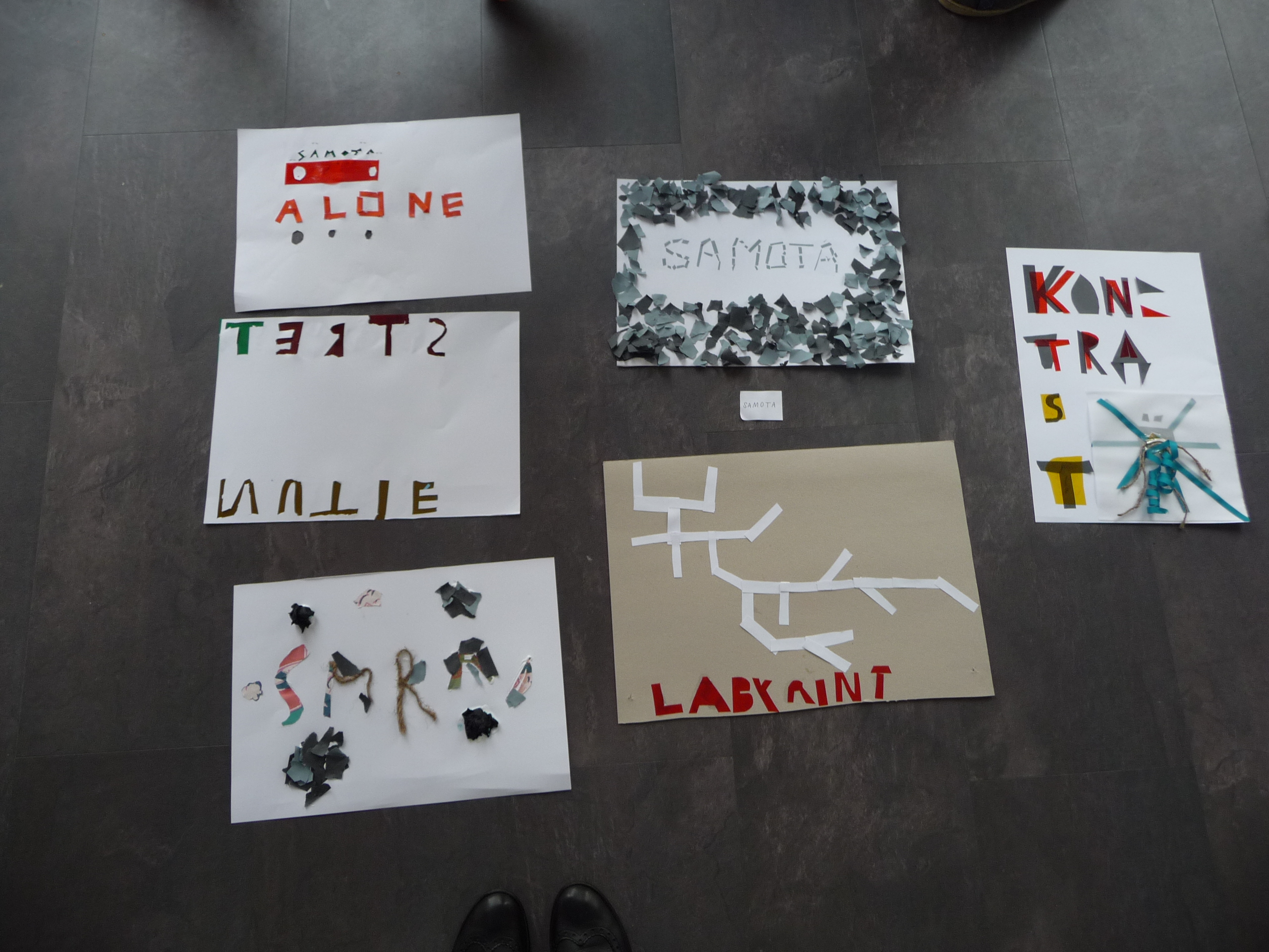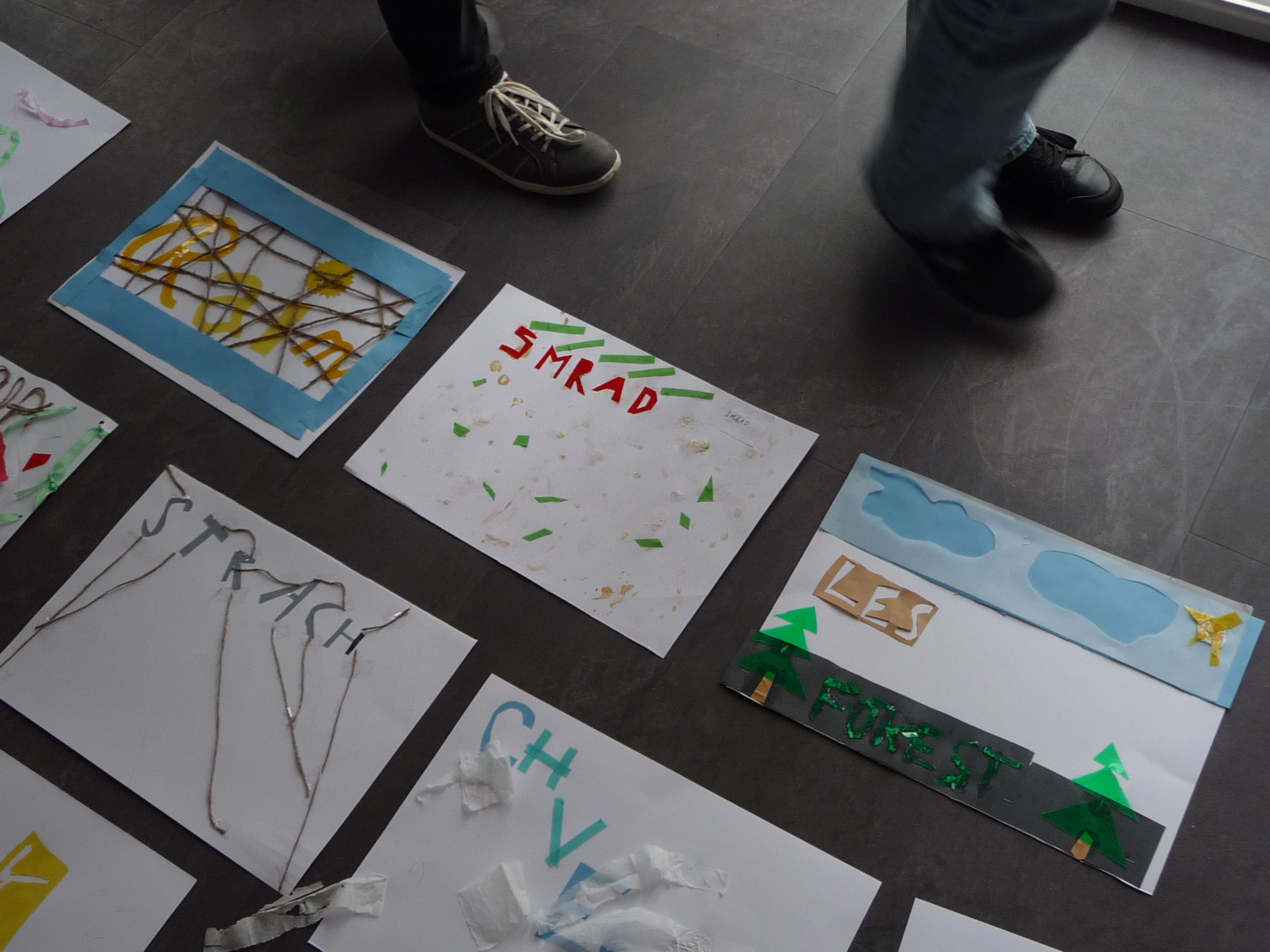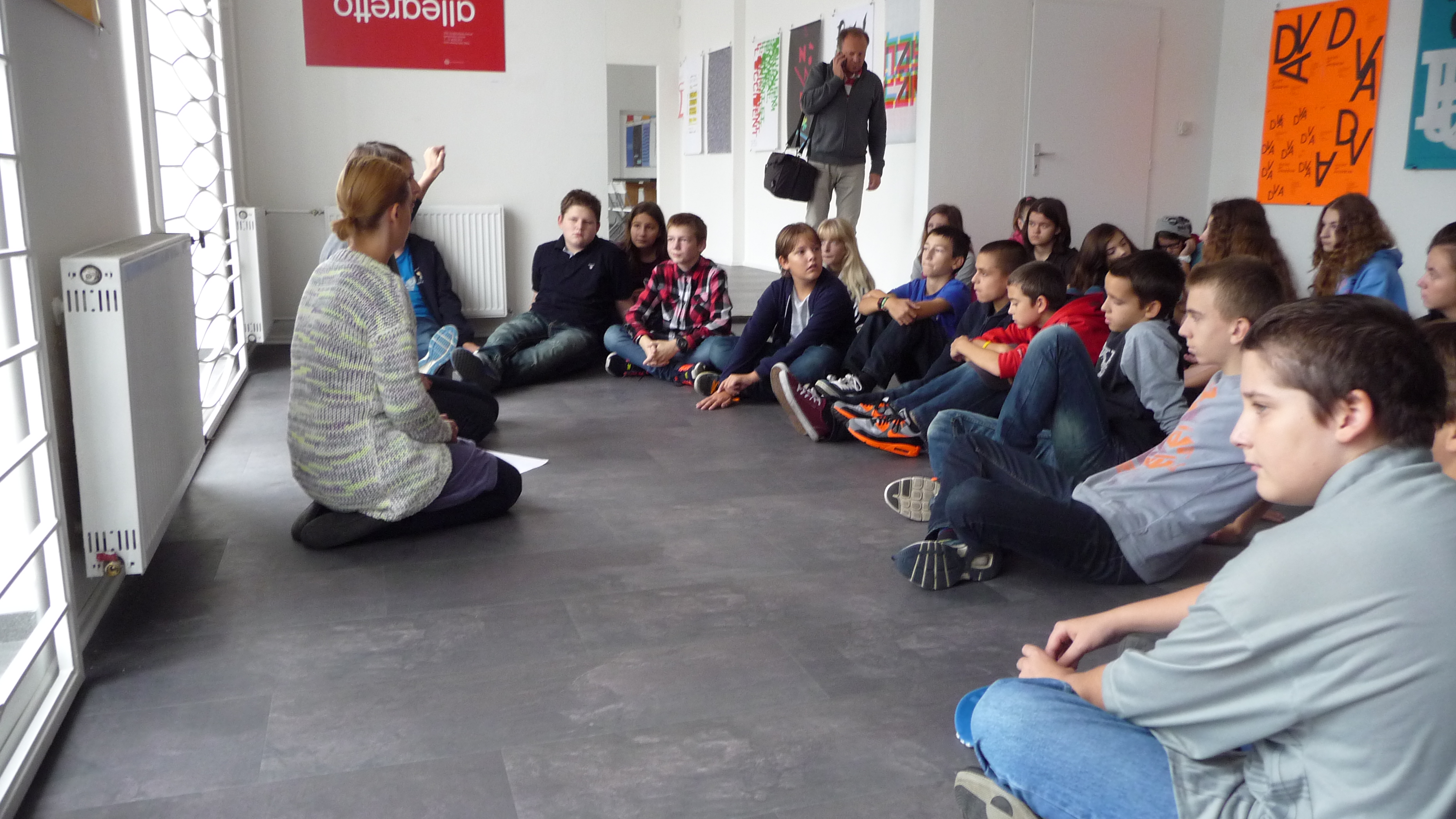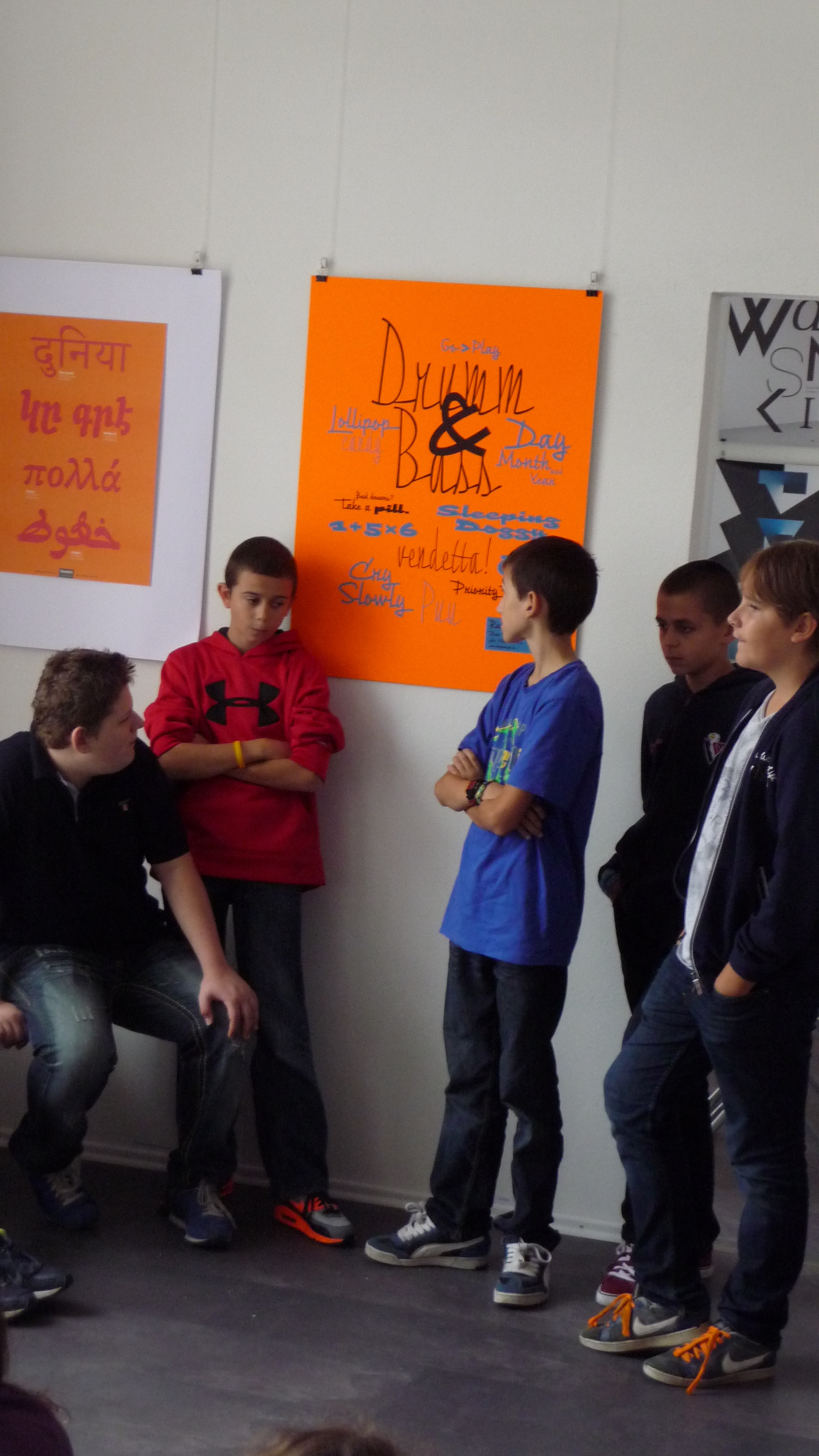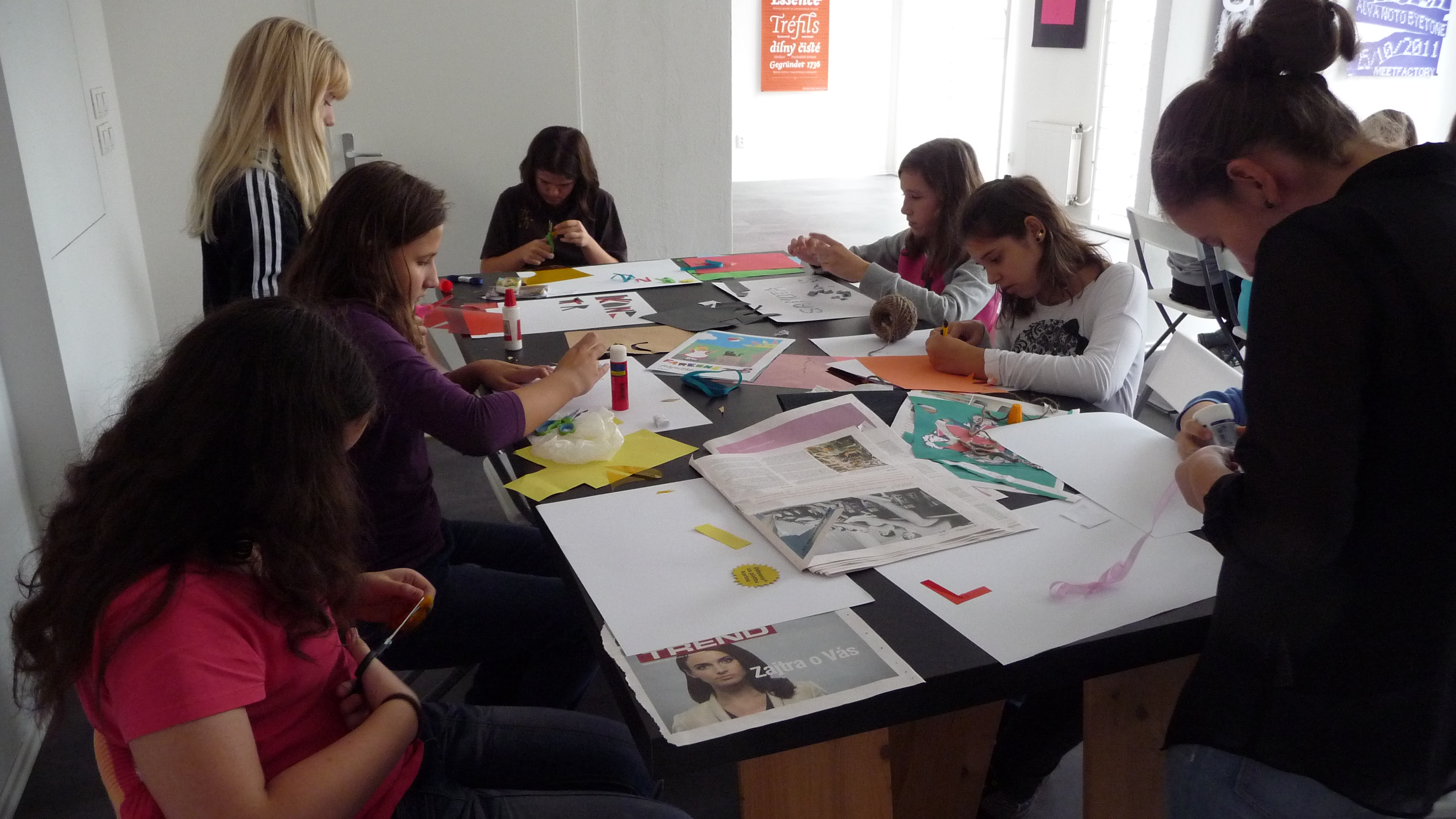 Najprv nám rozprávali len o jednoduchých veciach, čo je to dizajn, kde ho nájdeme, kde sa používa, …. potom plynule prešli do prekvapivo dlhej a bohatej histórie plagátu. Všetci načúvali s otvorenými ústami takúto prednášku nečakali. Začali sa na plagáty pozerať trochu inak. Po prezretí výstavy, ktorá bola dosť malá, ale veľmi bohatá na rôzne druhy typoplagátov, sme dostali náročnú, no zaujímavú úlohu. Mali sme zhotoviť svoj vlastný plagát pomocou lepidla, nožníc, rôznych druhov farebného papiera, ale nemali sme k dispozícii žiadne písacie potreby. Vylosovali sme si tému a začali tvoriť. Na papierikoch boli napísané témy: kontrast, stretnutie, origamy, smútok, vojna…Vytvorené plagáty boli veľmi nápadité a aj nás za ne pochválili. Cestou do školy bol nadšený džavot siedmakov počuť až na druhý koniec ulice.