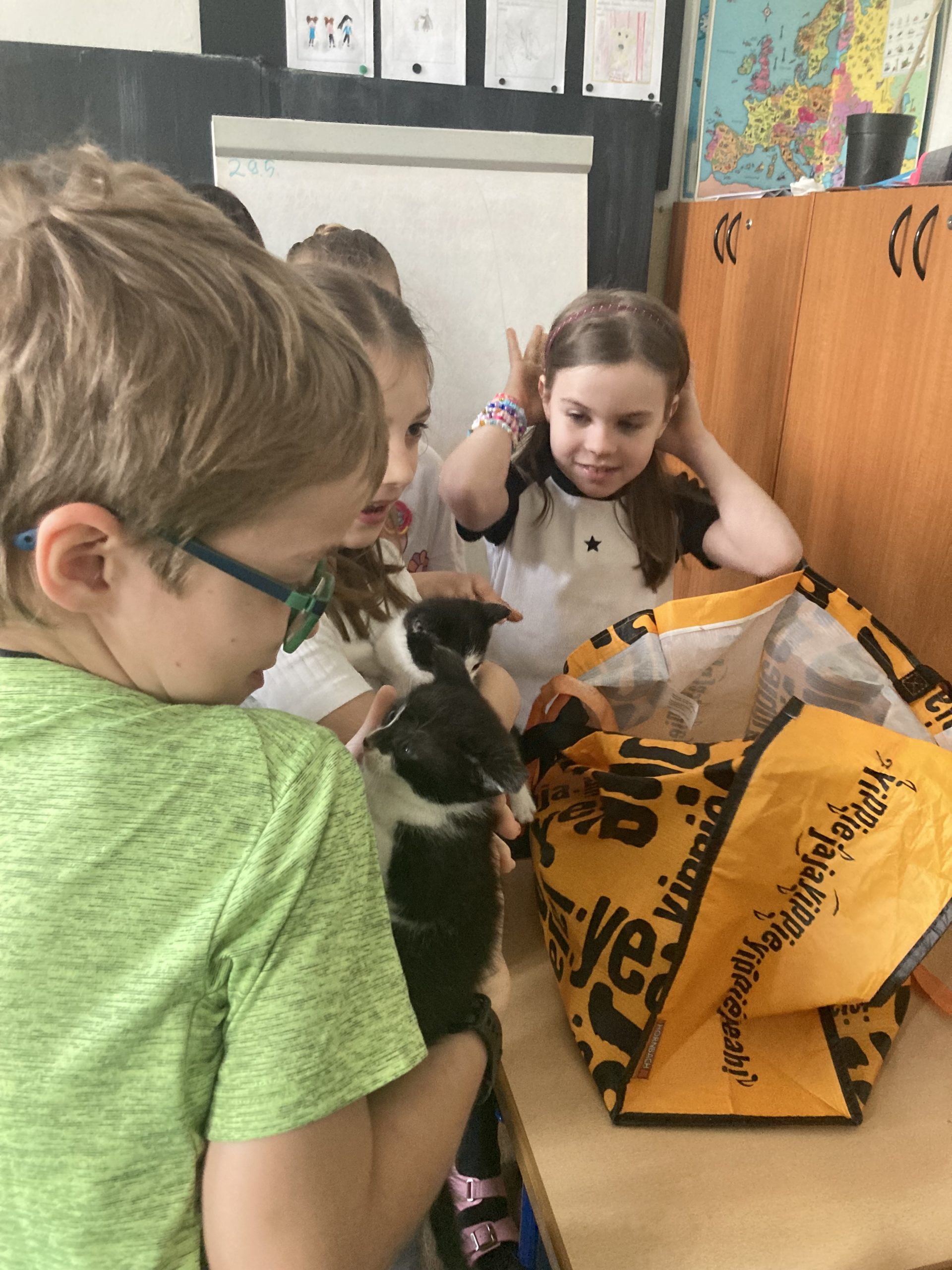 V pondelok ráno privítali žiakov v 3.A maličké mačiatka. Deti sa učili, ako ich opatrne chytiť tak, aby im neublížili a pohladkať, aby sa nevyplašili.