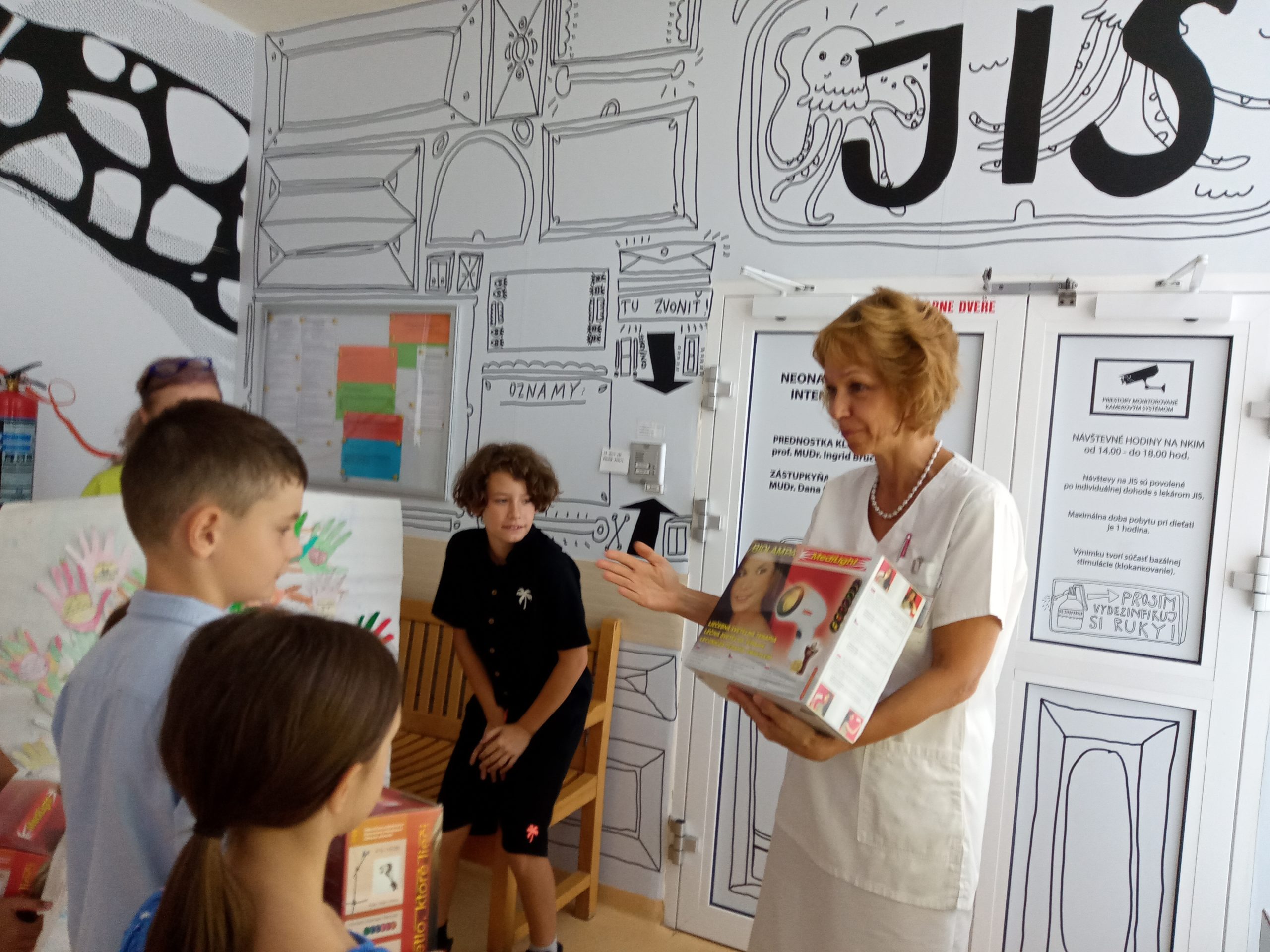 Deti pomáhajú deťom – táto krátka veta vystihuje prekvapenie, ktoré pre naše pracovisko – Neonatologickej kliniky intenzívnej medicíny LFUK a NÚDCH pripravili deti zo Základnej školy Milana Hodžu v Bratislave. V rámci detskej školskej burzy sa deti rozhodli získaný výťažok venovať našim najmenším pacientom. Spočiatku uvažovali nad hračkami. Nakoniec sa rozhodli pre zakúpenie troch liečebných prístrojov: biolámp. Biolampa je prístroj založený na princípe liečby polarizačným svetlom, ktorý využíva elektromagnetické účinky na organizmus. Terapia svetlom je bezbolestná a bezpečná zároveň. Urýchľuje regeneračné procesy. Je významným pomocníkom pri liečbe zle hojacich sa rán aj neonatológii.